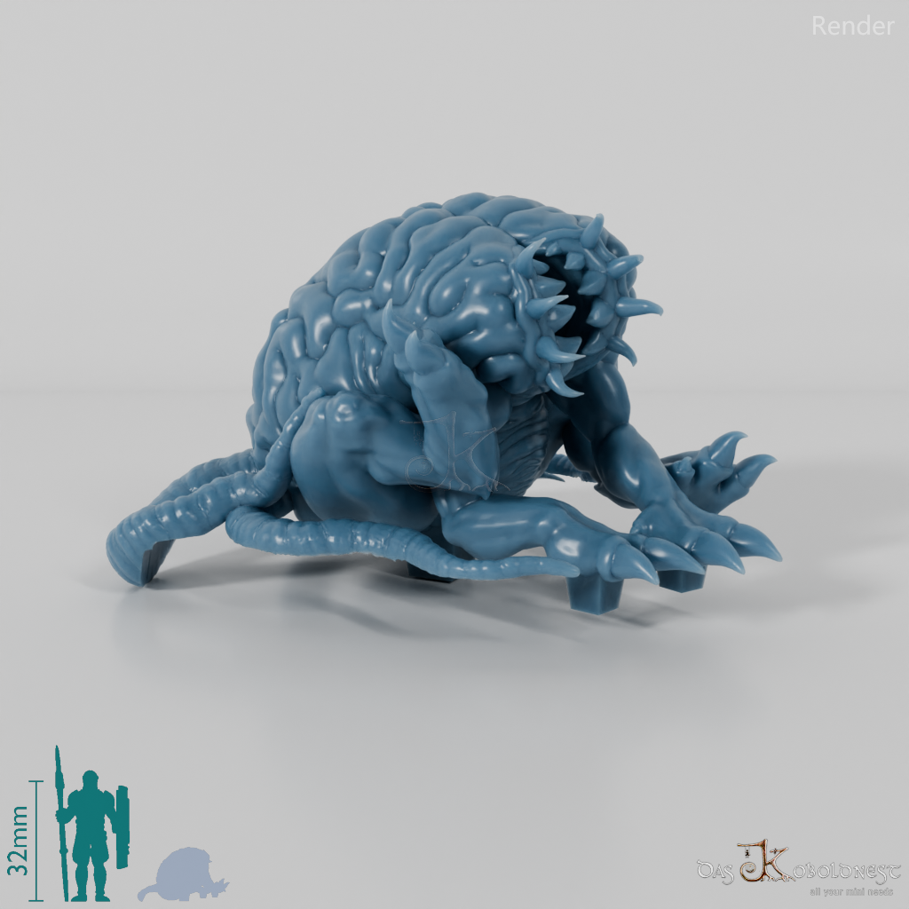 Großes Gehirn mit Armen, Beinen und einem zahnbewehrten Schlund, dem vier Tentakel aus dem Hinterkörper wachsen.
