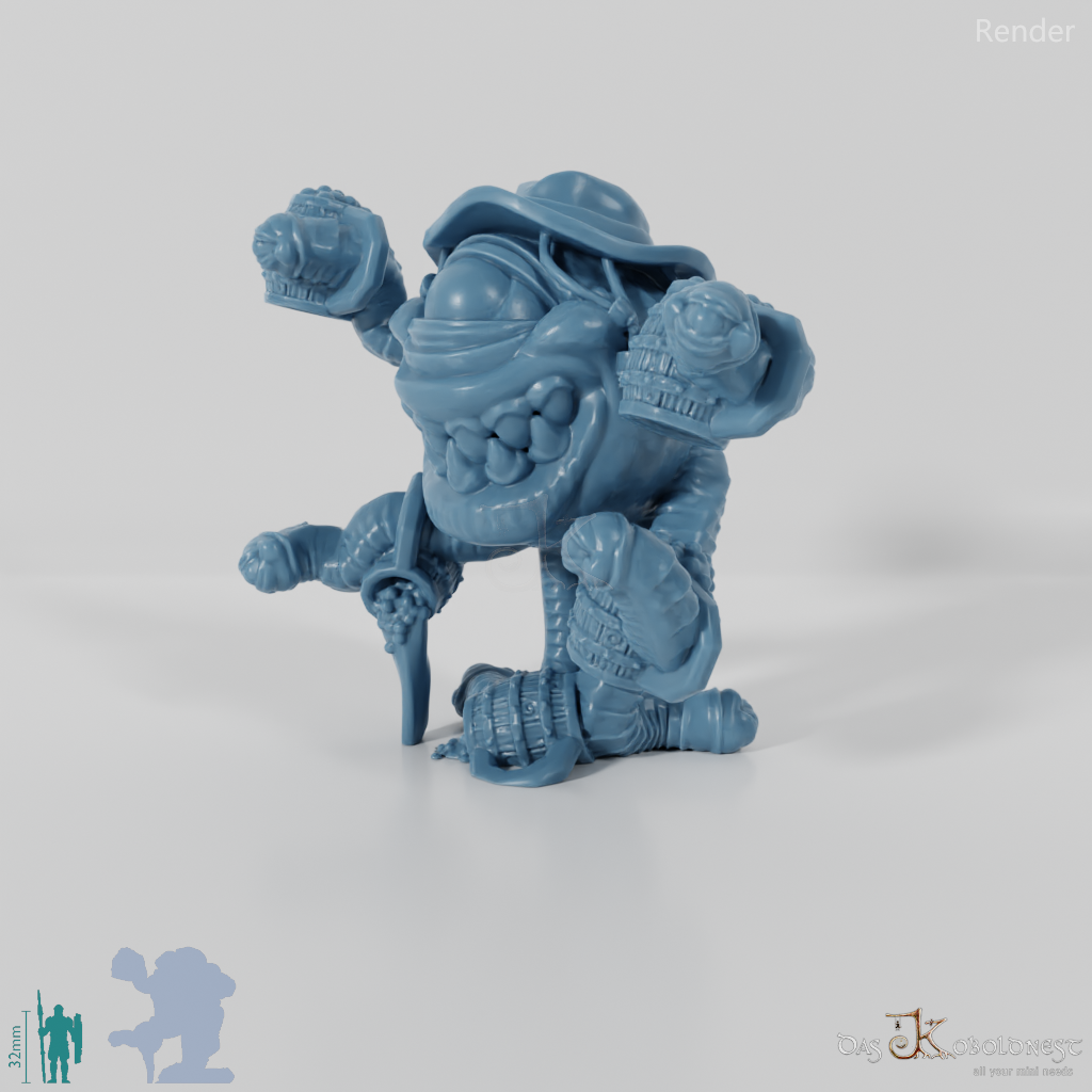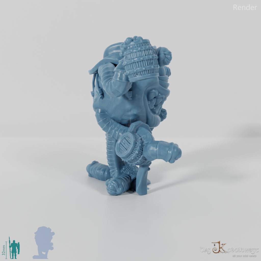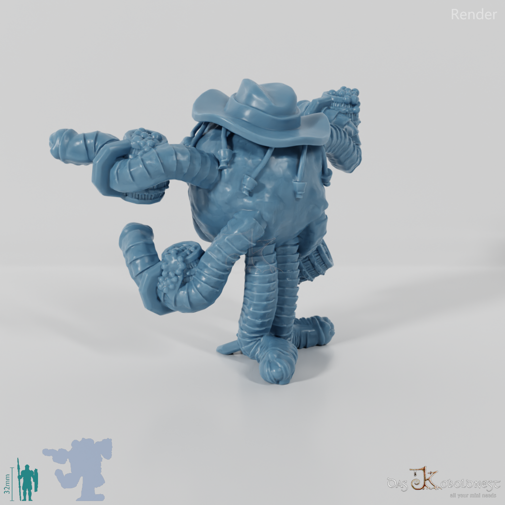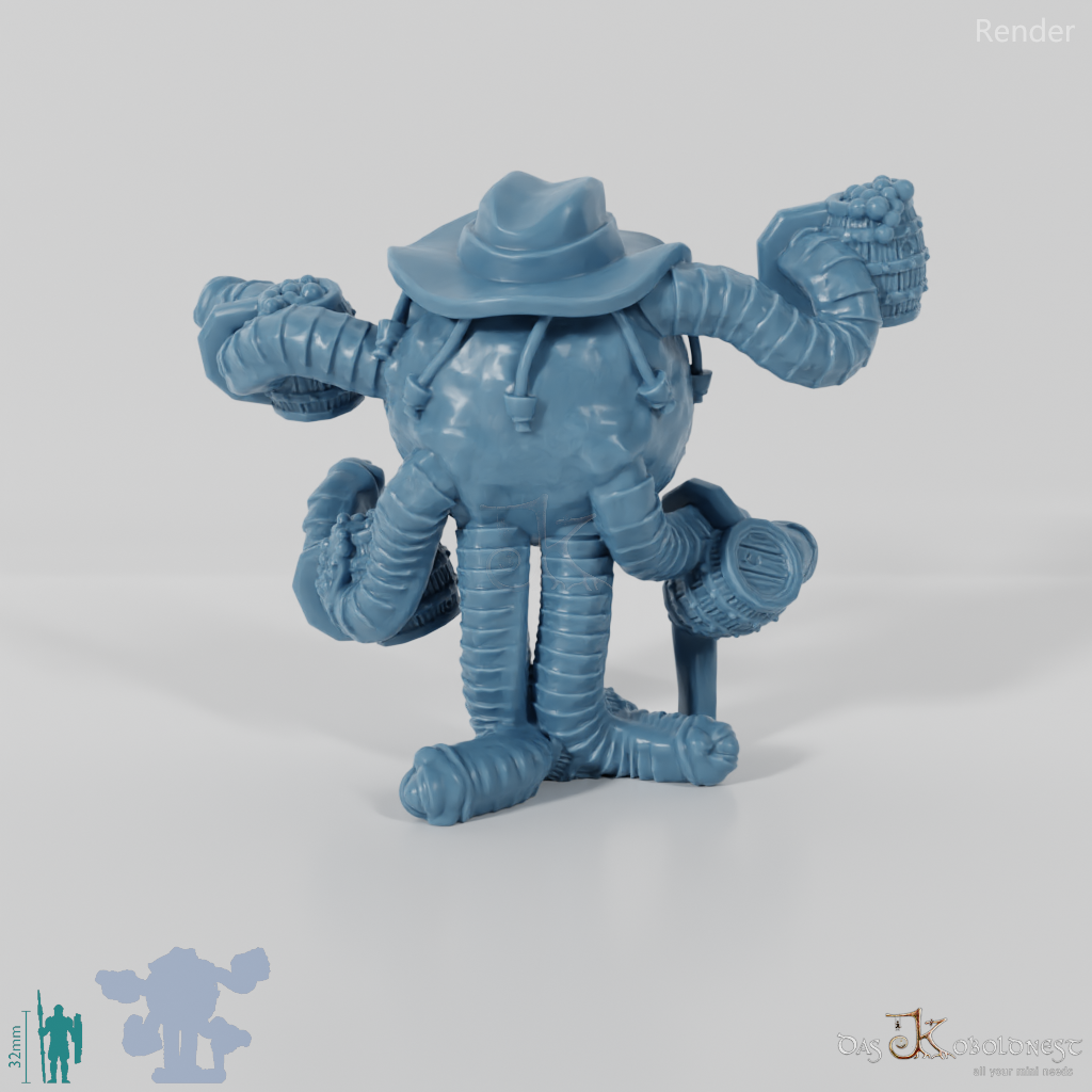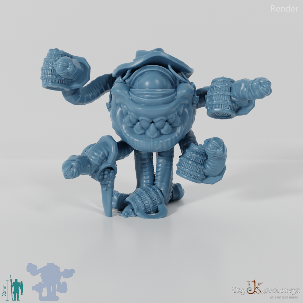 Schwebendes Auge mit Trachtenhut und vier Bierkrügen an den Tentakeln. Figur steht auf zwei ihrer Tentakelaugen Modell: Monster Monday - Beerholder by DarkRealms, lizenziert unter CC BY 3.0.