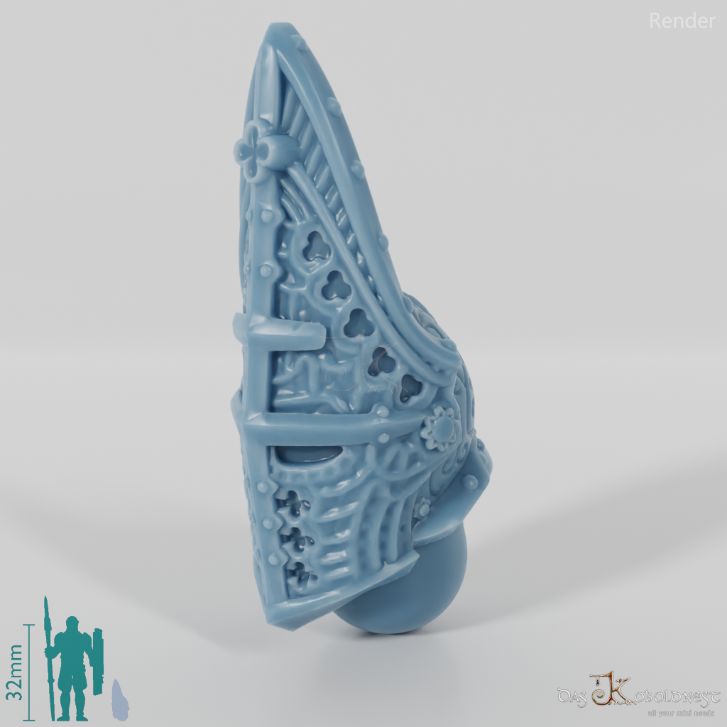 Langgezogener, verzierter Helm mit Kreuzsymbolik