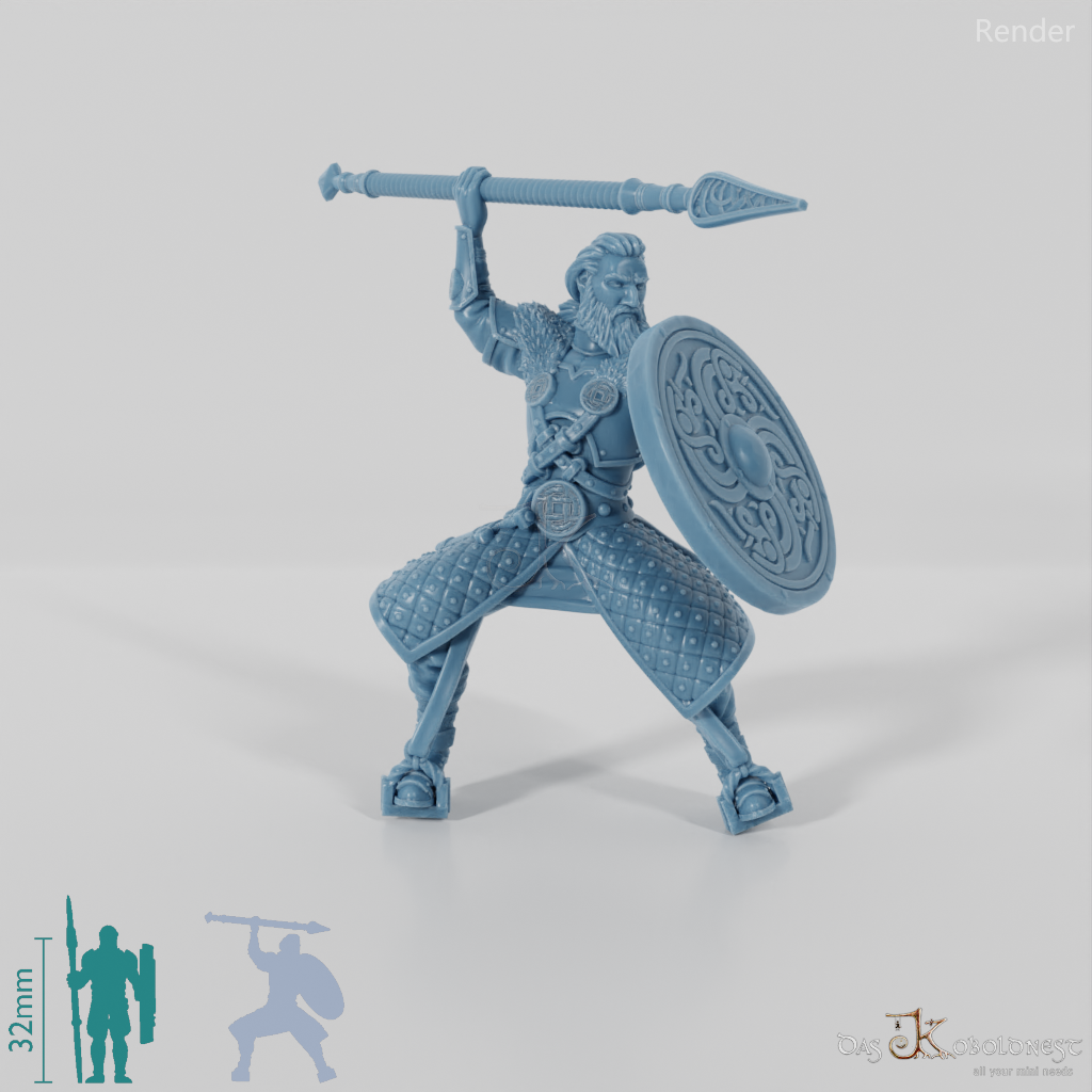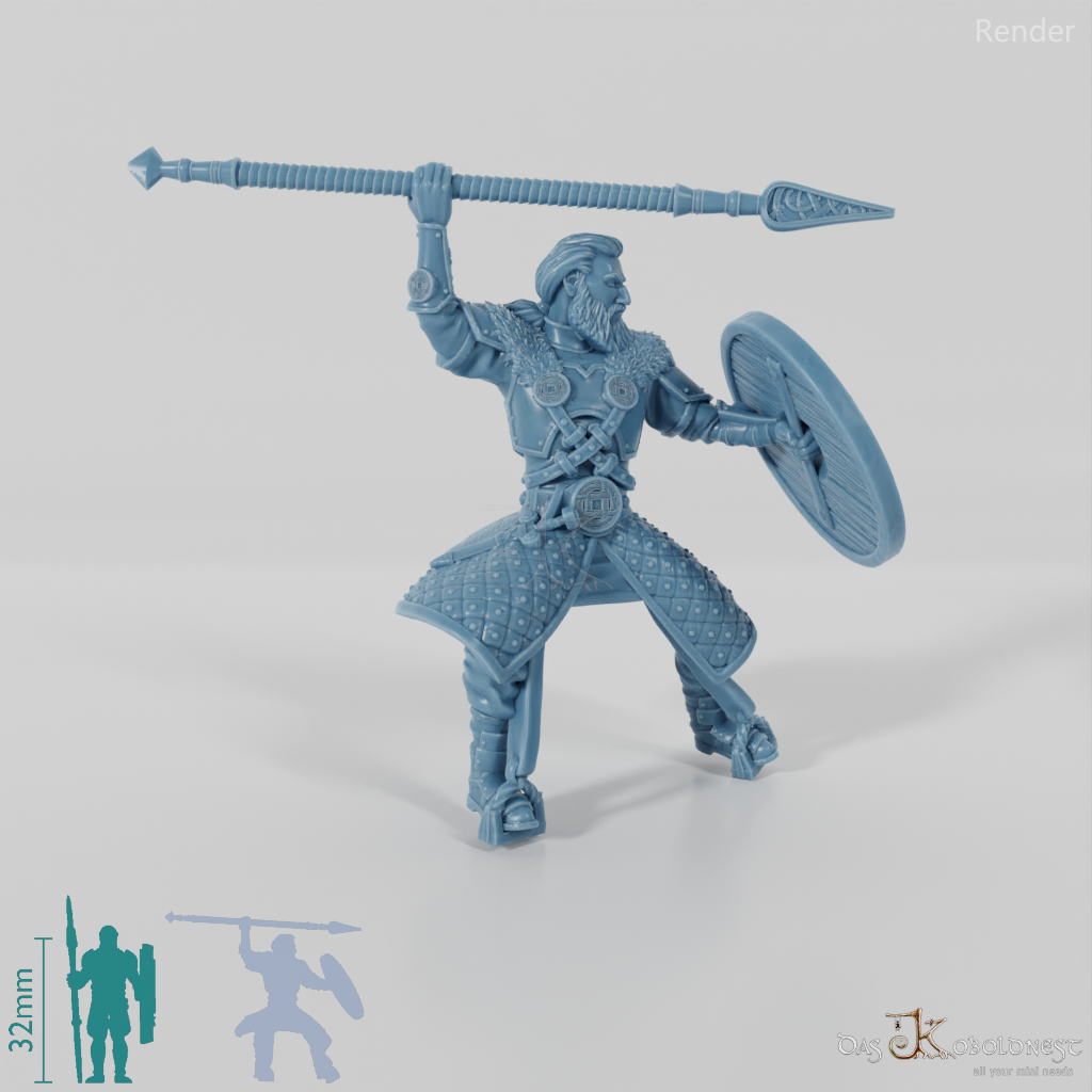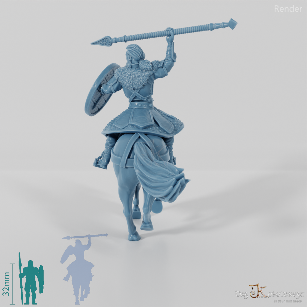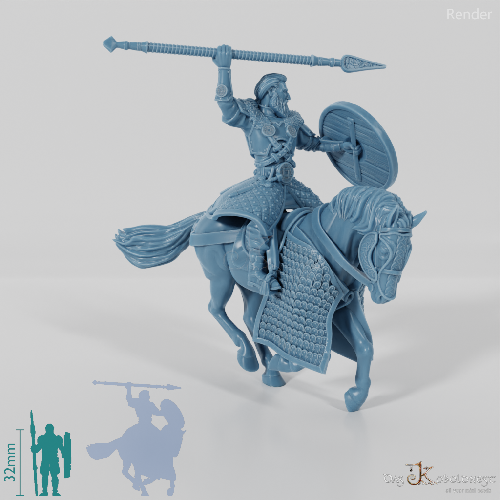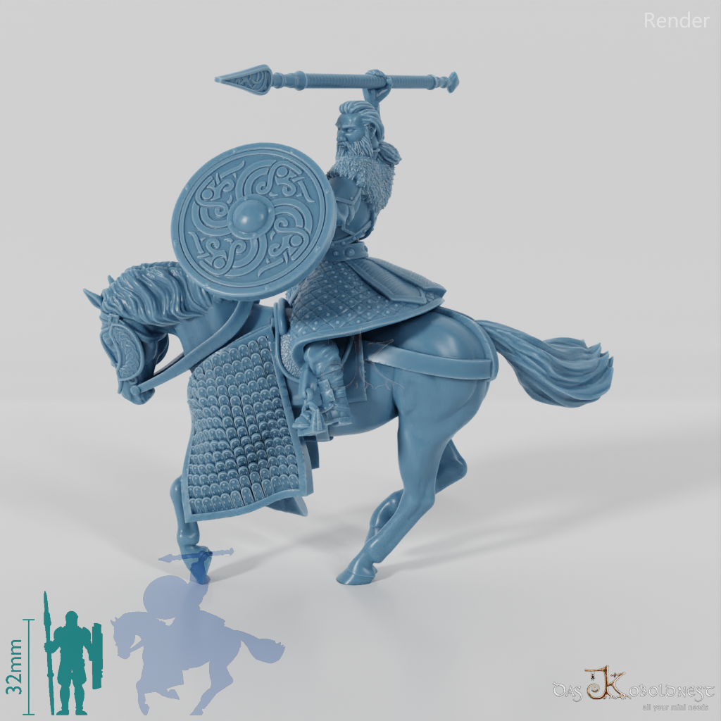 Höre den Wind heulen und das Hufgetrappel näherkommen, wenn Ebremer, der mutige Prinz der Pferdeherren, mit eindrucksvoller Entschlossenheit in den Angriff reitet. Mit seinem zum Wurf erhobenen Speer, dem schützenden Schild und seiner markanten Rüstung, verziert mit feinen Knotenmustern, zeigt er seine unerschütterliche Kriegerseele. Sein langes, zu einem Pferdeschwanz gebundenes Haar und der stolze Vollbart betonen seine edle Abstammung und das Erbe der Pferdeherren. Zusammen mit seinem gepanzerten Kriegsross bildet er ein Symbol für Stärke und Ehre.