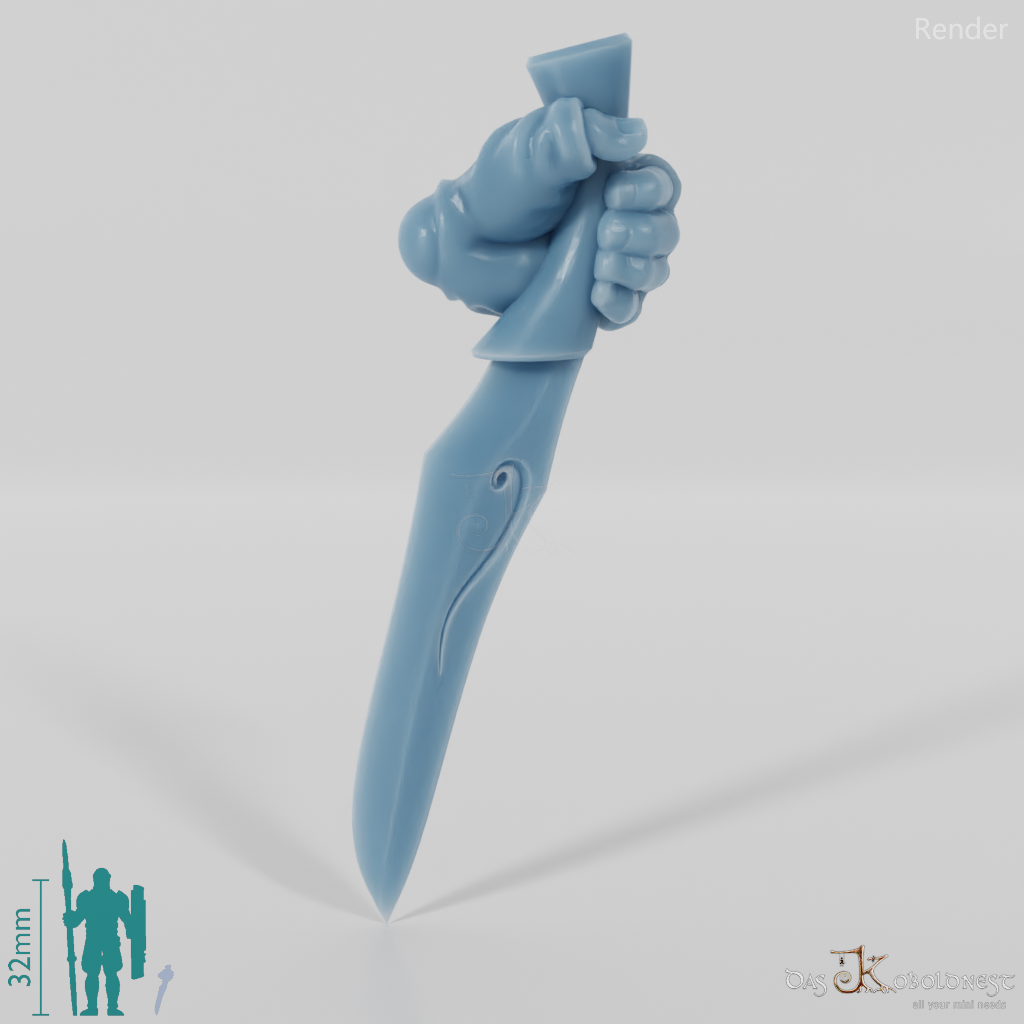 Schlanker, verzierter Elfendolch, der von einer Hand mit fingerlosen Handschuhen gehalten wird. Das Modell kann beliebig mit allen modularen Modellen der Reihe "Die Elfen versammeln sich" kombiniert werden. Modell wahlweise mit rechter oder linker Hand verfügbar.