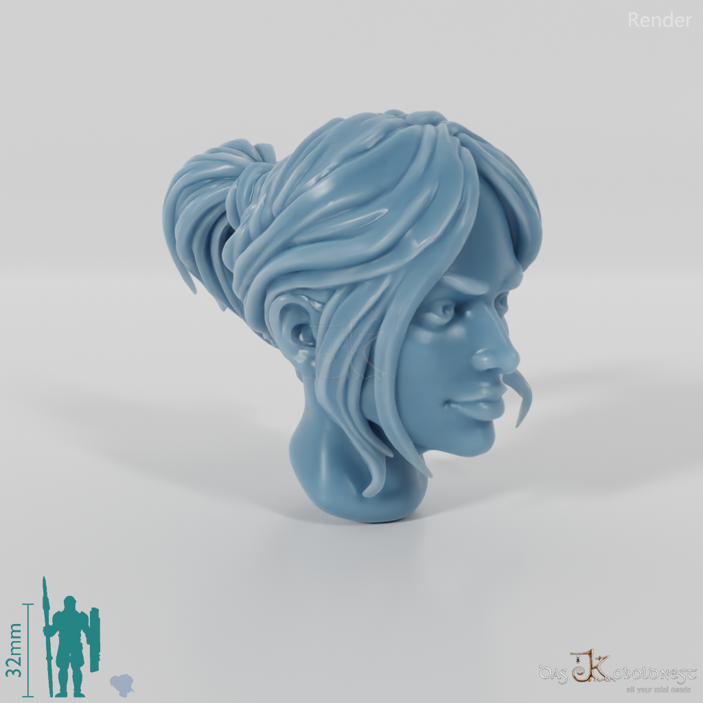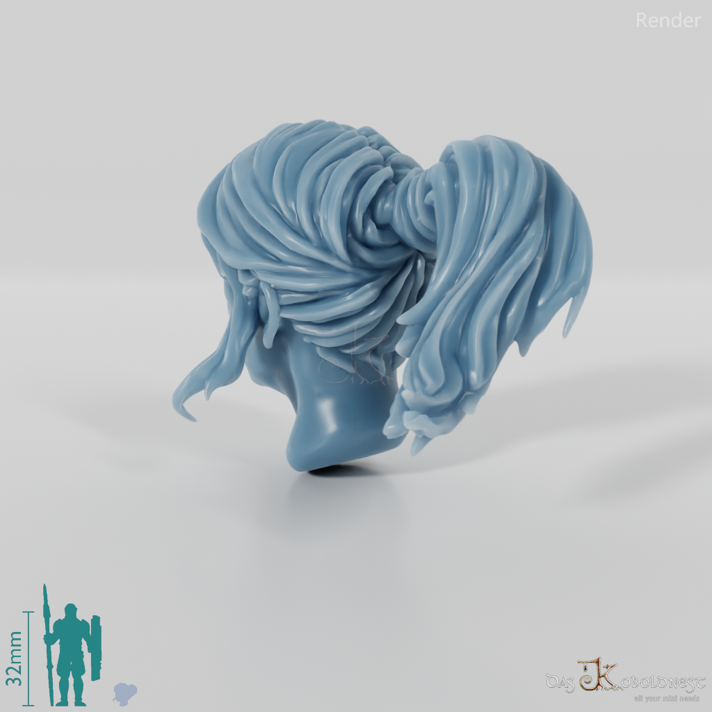 Frauenkopf mit langen, zu einem Pferdeschwanz gebundenen Haaren