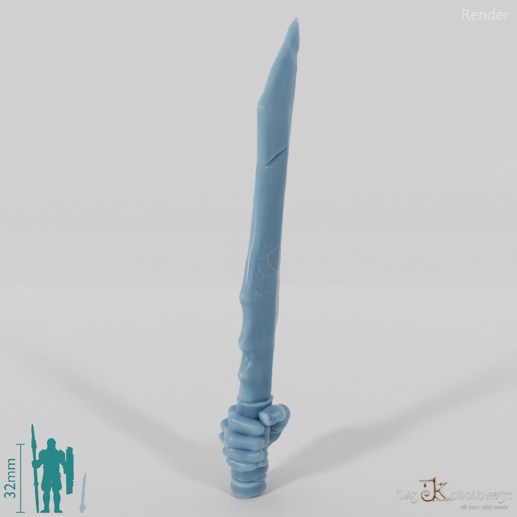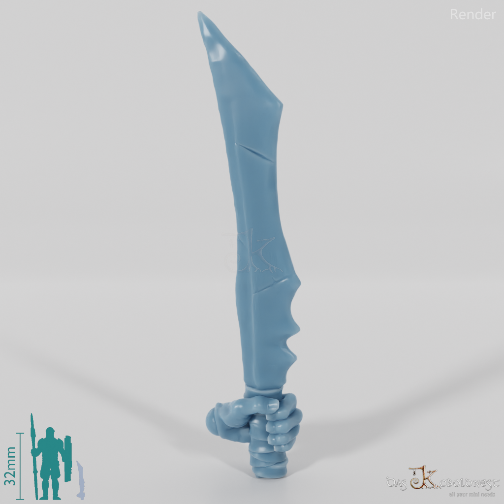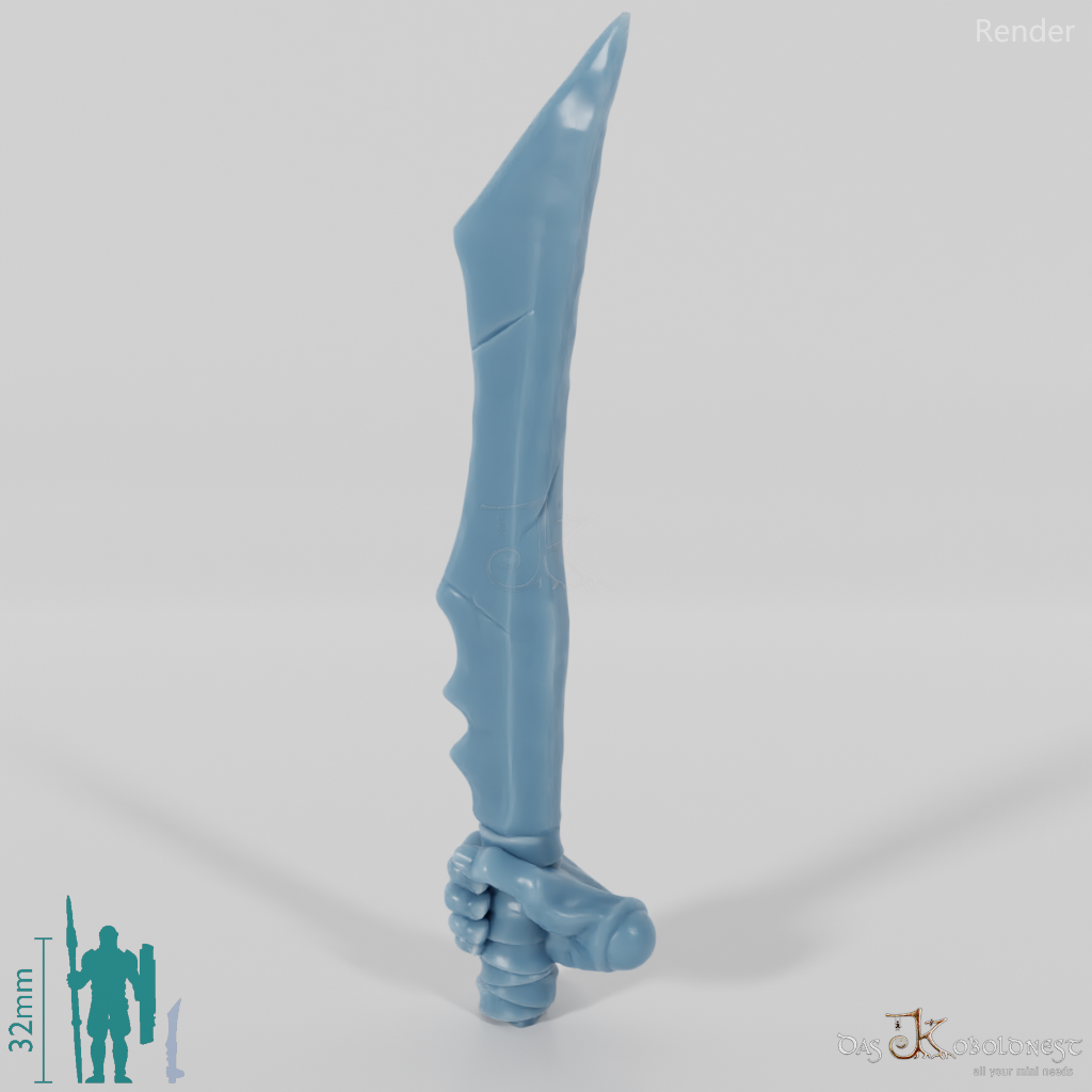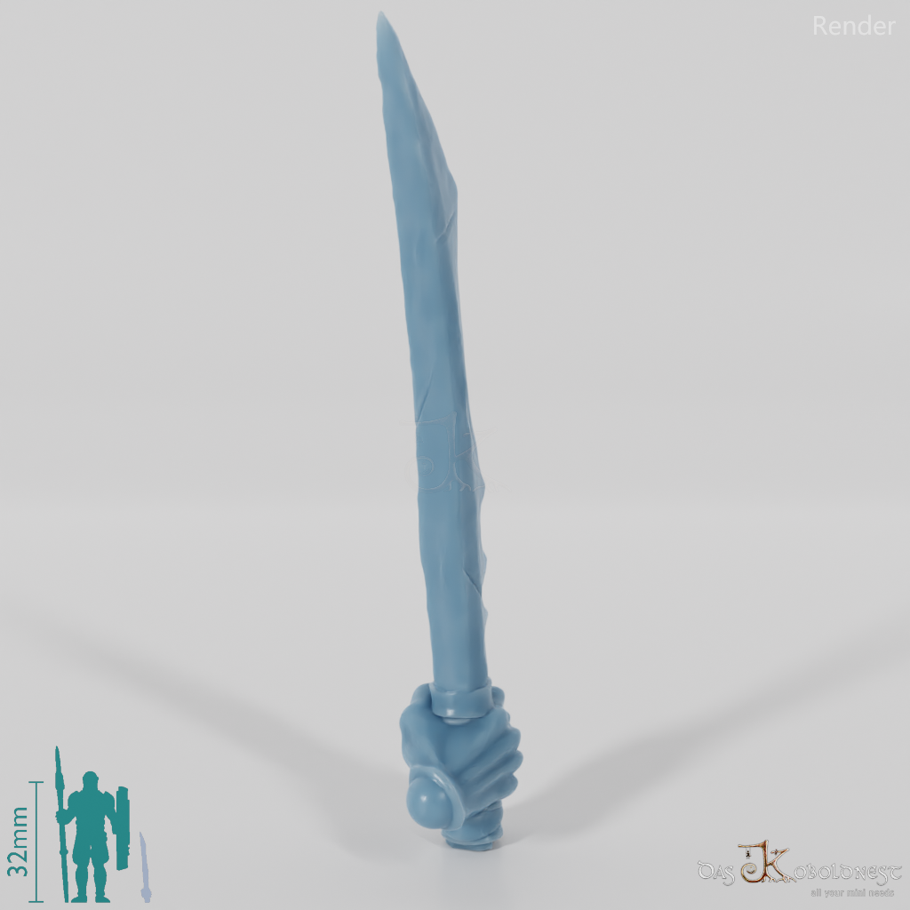 Grob gearbeitetes Schwert, das von einer sehnigen Hand gegriffen wird. Das Modell kann beliebig mit allen modularen Modellen der Reihe "Die kämpfenden Halborks" kombiniert werden. Im Customizer von The Printing Goes Ever On kannst du dir selbst eine Vorschau deiner modularen Halborks erstellen und die perfekten Kombinationen für dich finden. Außerdem kannst du im Customizer über den "Share"-Button einen individuellen Link für dein Modell erstellen und diesen direkt per Kontaktformular oder Mail an info@koboldnest.de mit uns teilen, sodass wir dein Wunschmodell mit allen zusammengehörenden Teilen direkt für dich produzieren können. Modell wahlweise mit rechter oder linker Hand an der Waffe verfügbar.