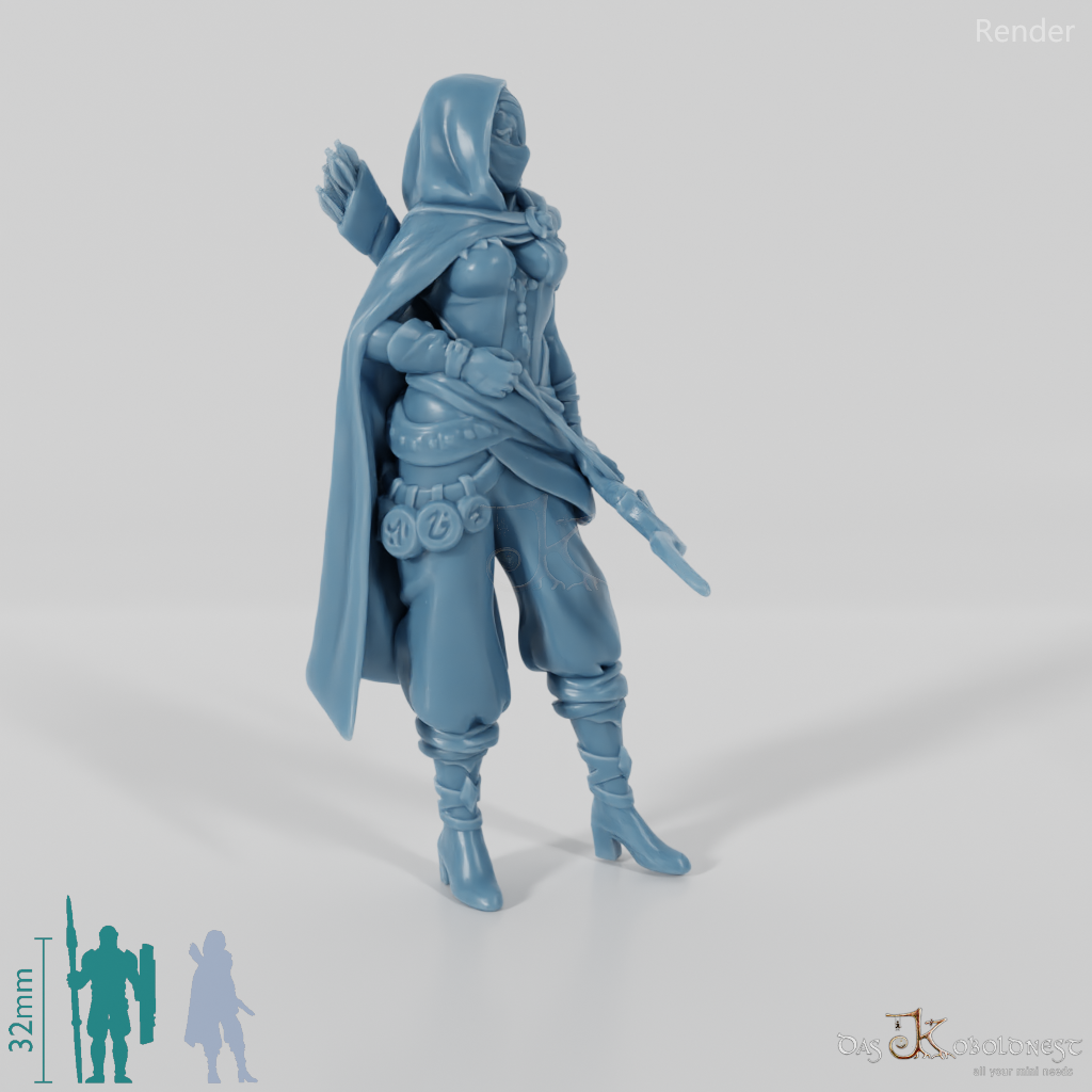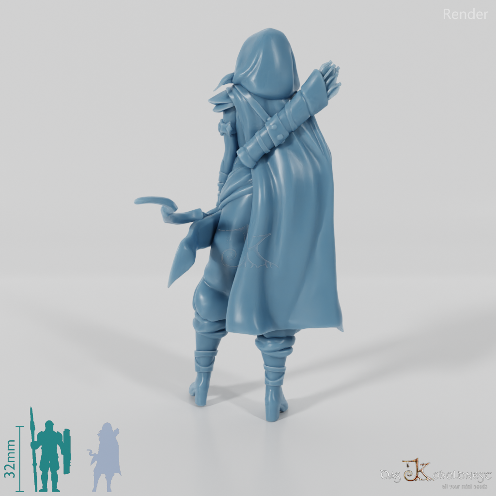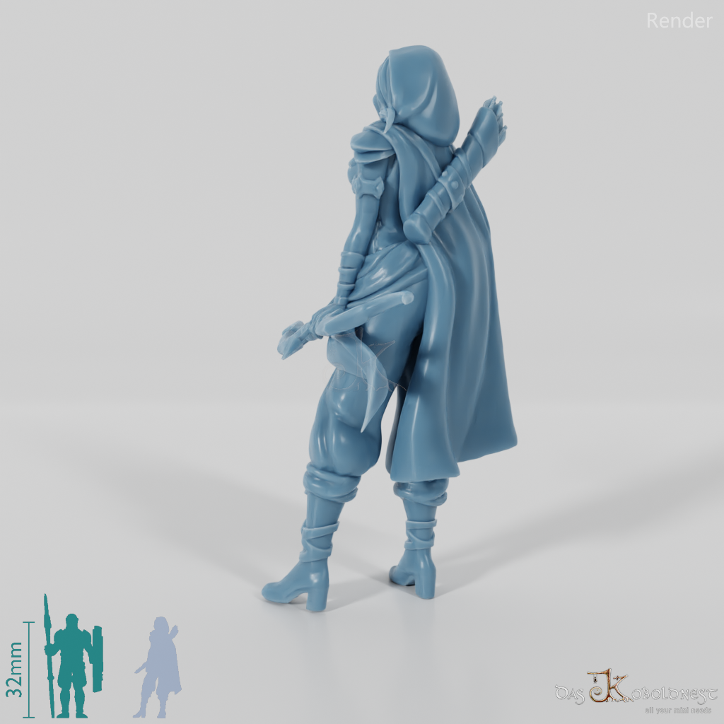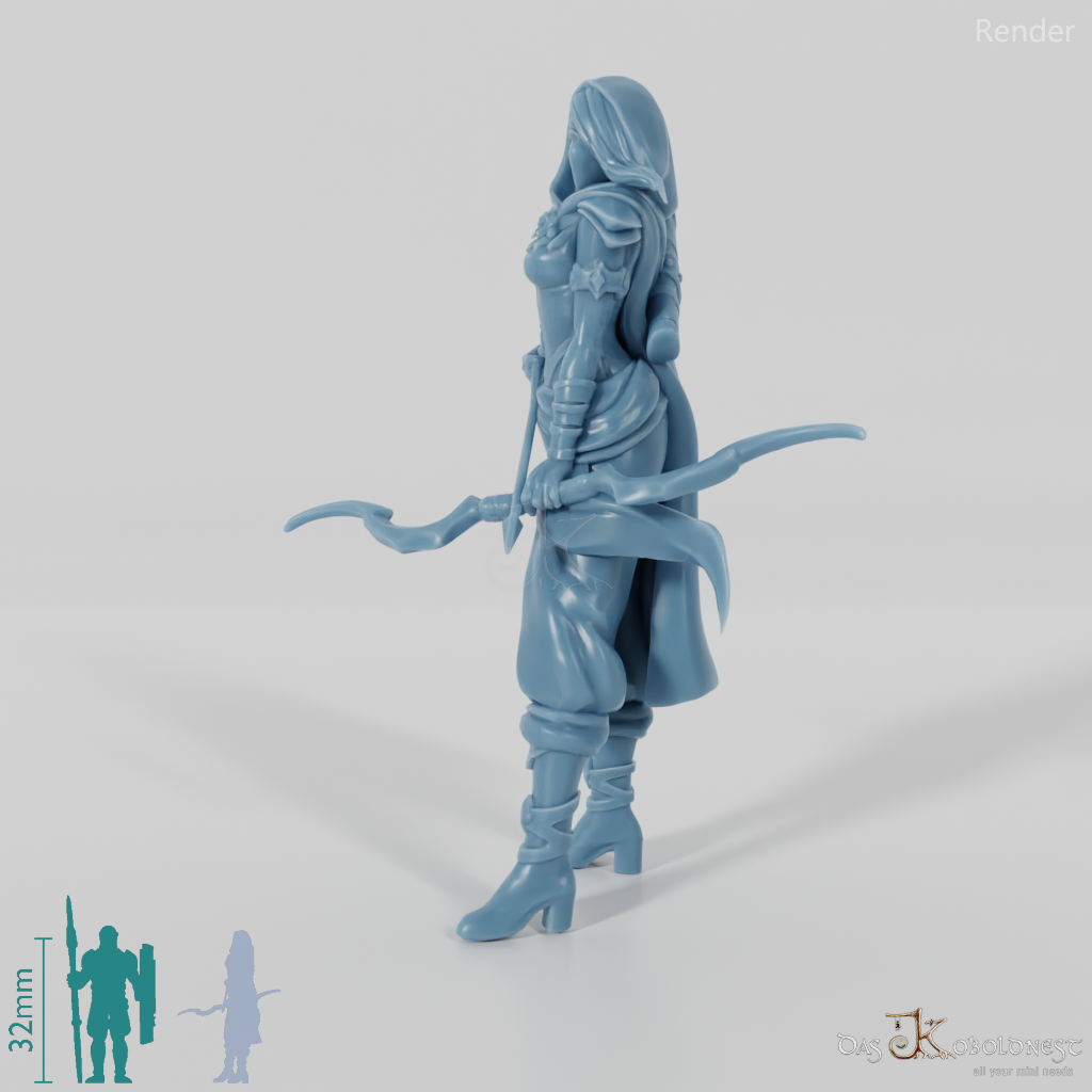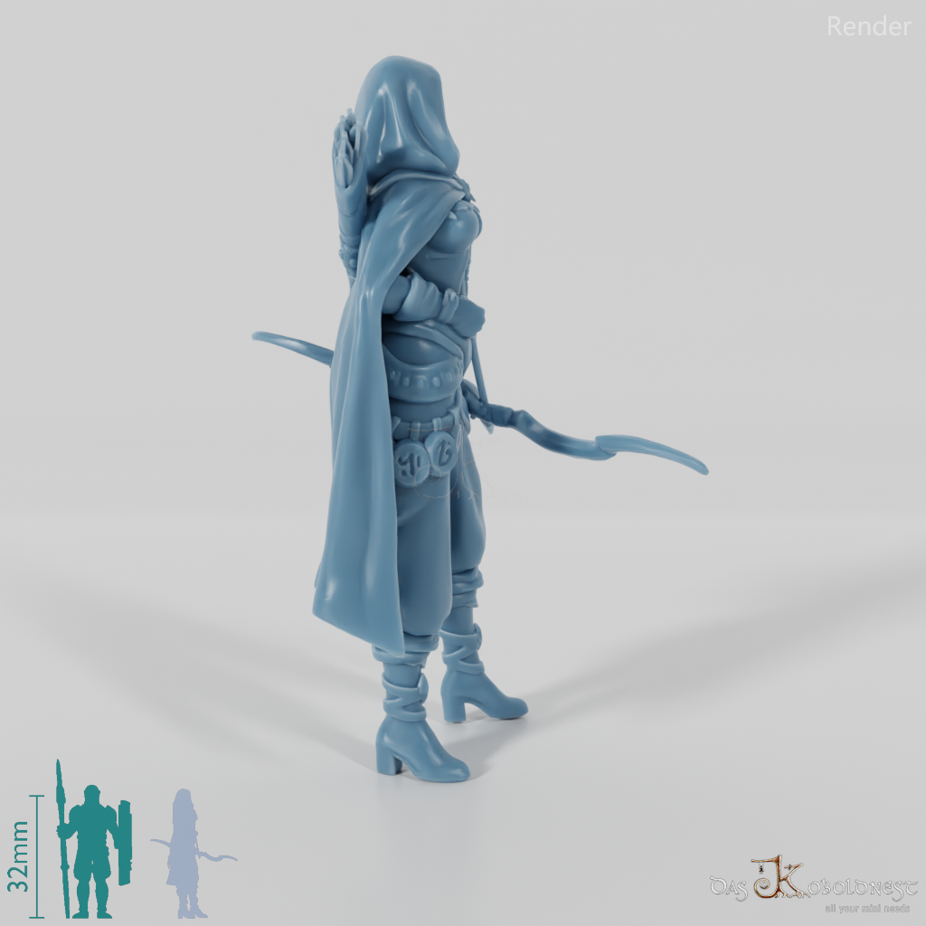 Frau in weiter Kleidung, Umhang und Kapuze, die einen Pfeil auf einen gekrümmten Bogen auflegt