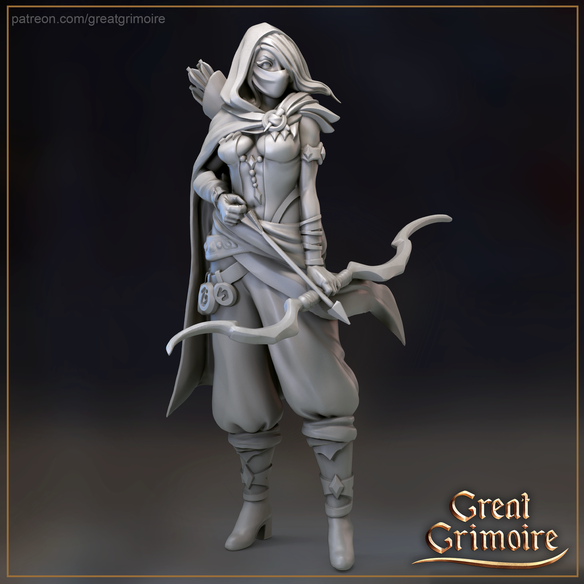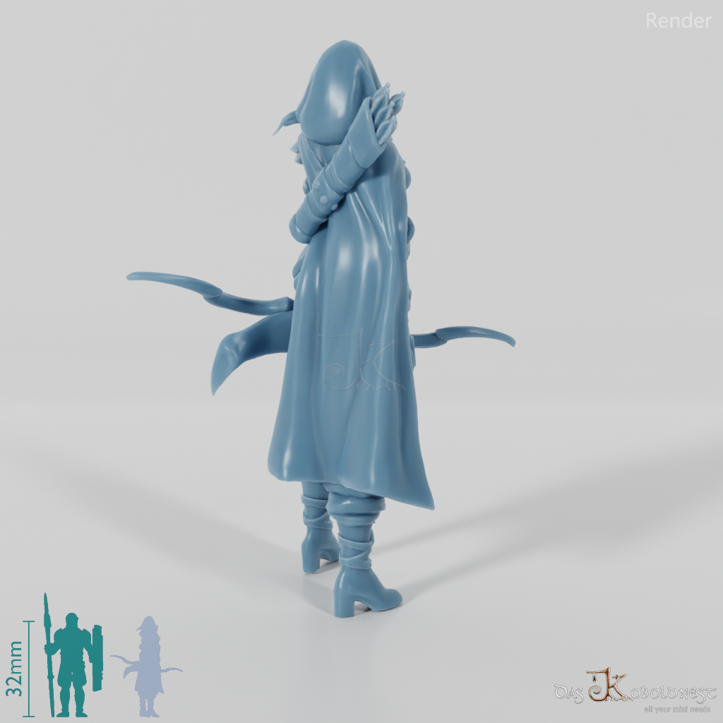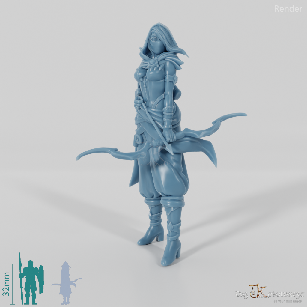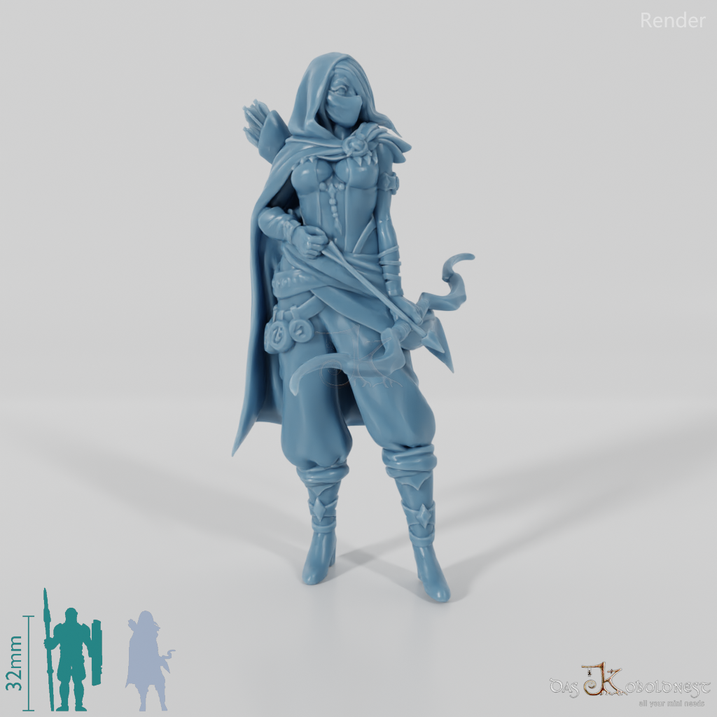 Frau in weiter Kleidung, Umhang und Kapuze, die einen Pfeil auf einen gekrümmten Bogen auflegt