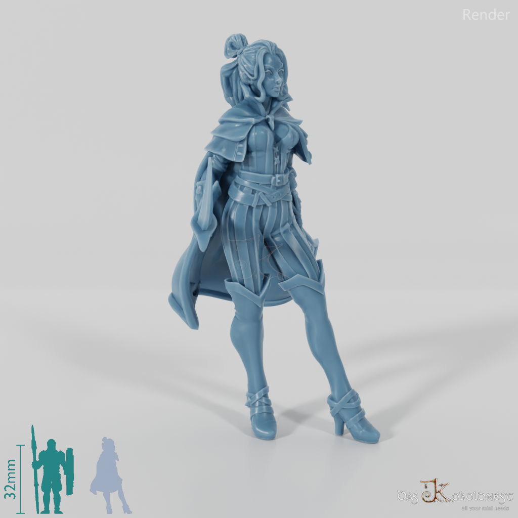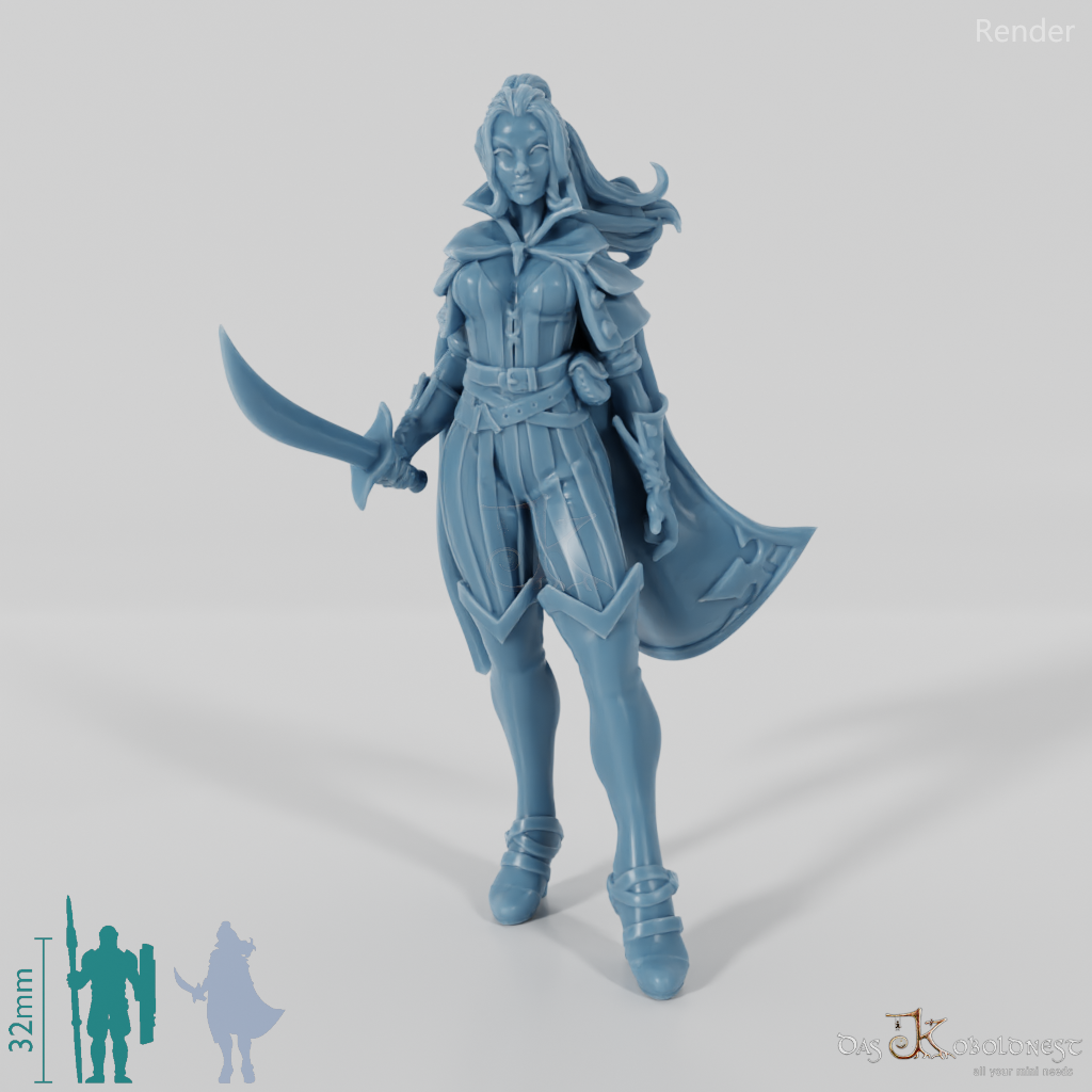 Frau mit langen Haaren, wehendem Umhang und hochhackigen Schuhen, die mit einem geschwungenen Säbel bewaffnet ist