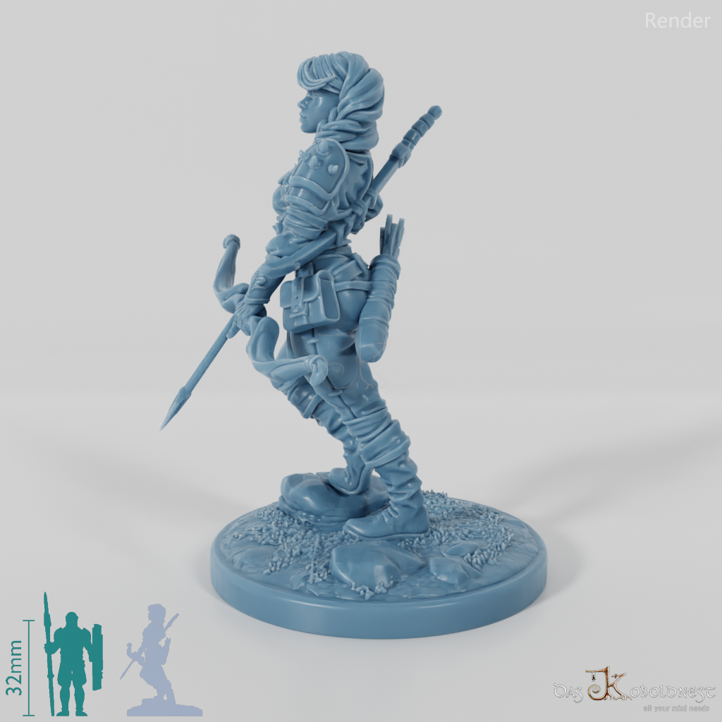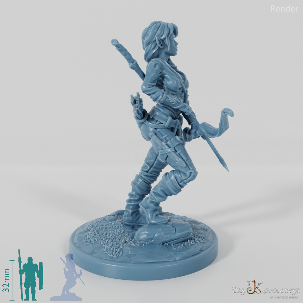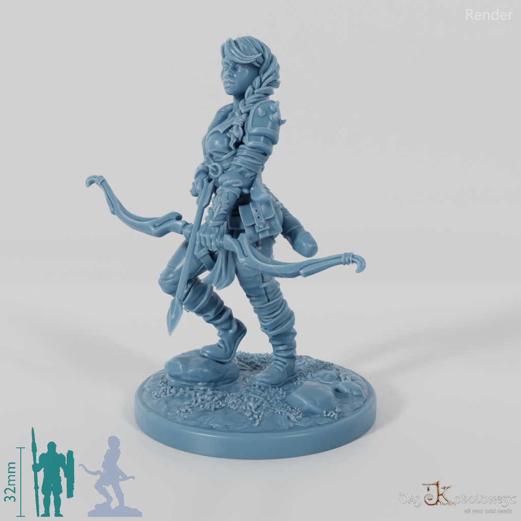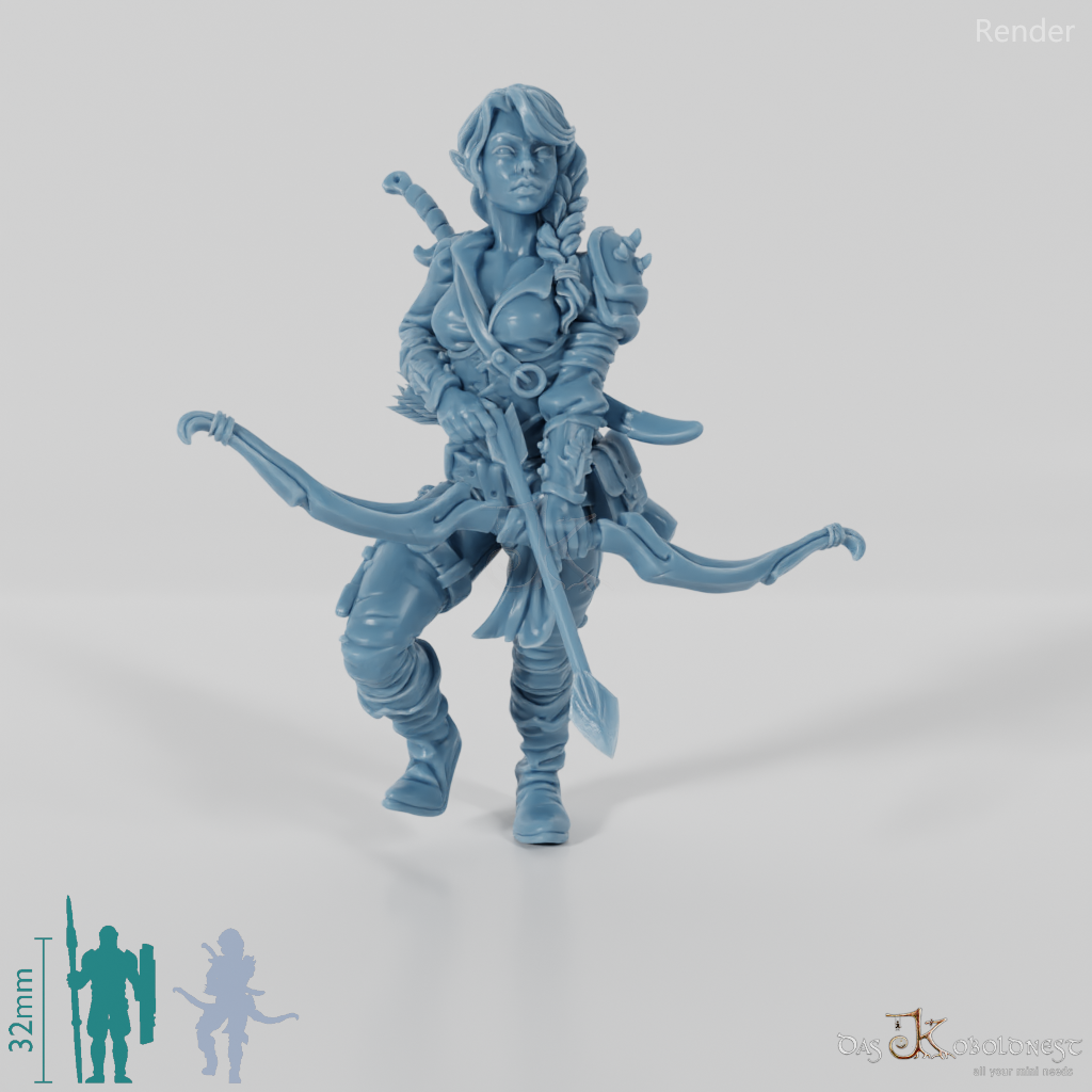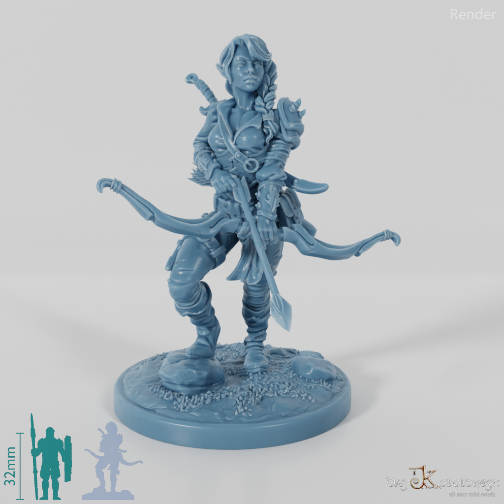 Elfe mit geflochtenen Haaren und Lederrüstung, die mit einem geschwungenen Bogen bewaffnet ist Modell wahlweise mit oder ohne szenische 25 mm Rundbase verfügbar