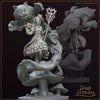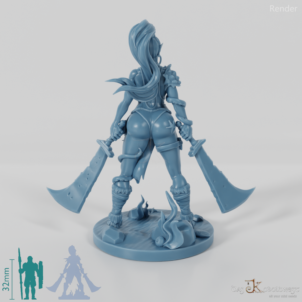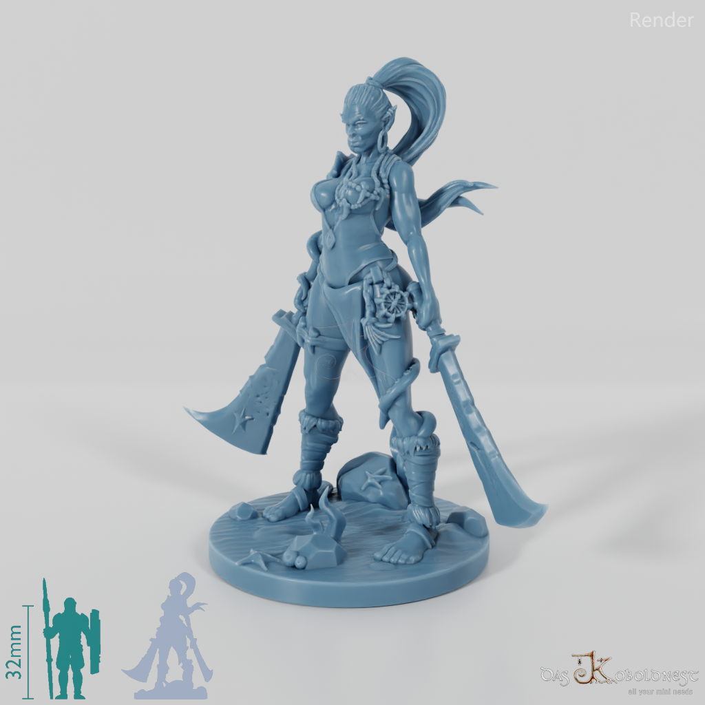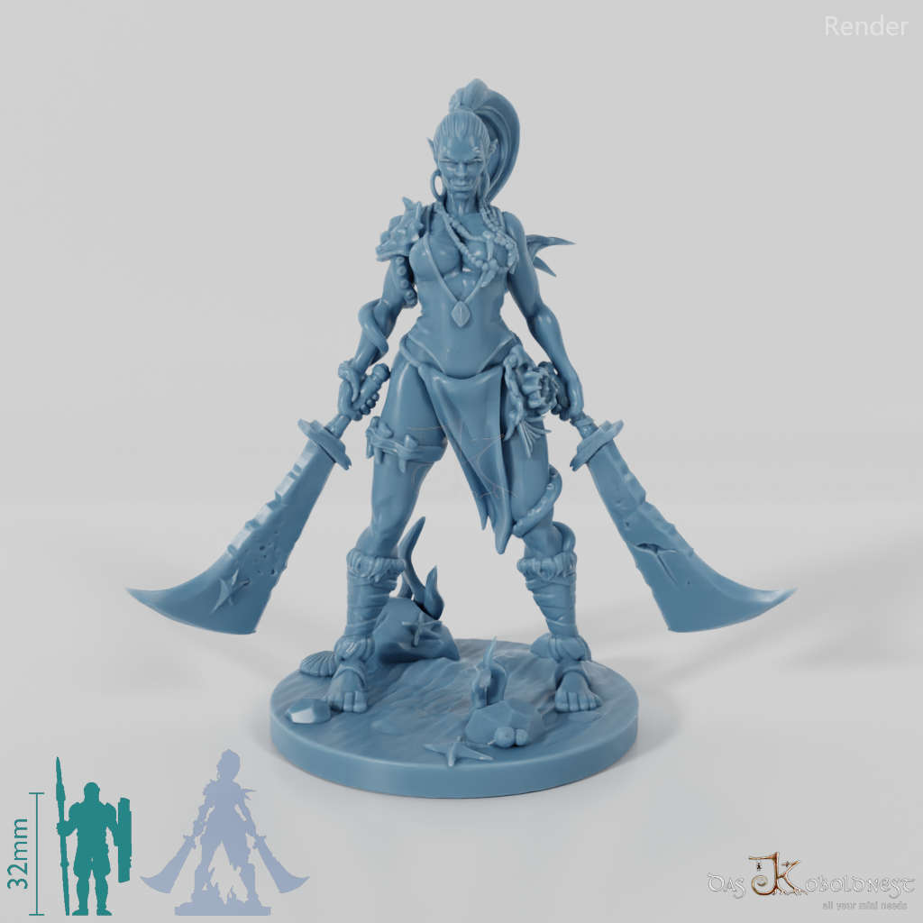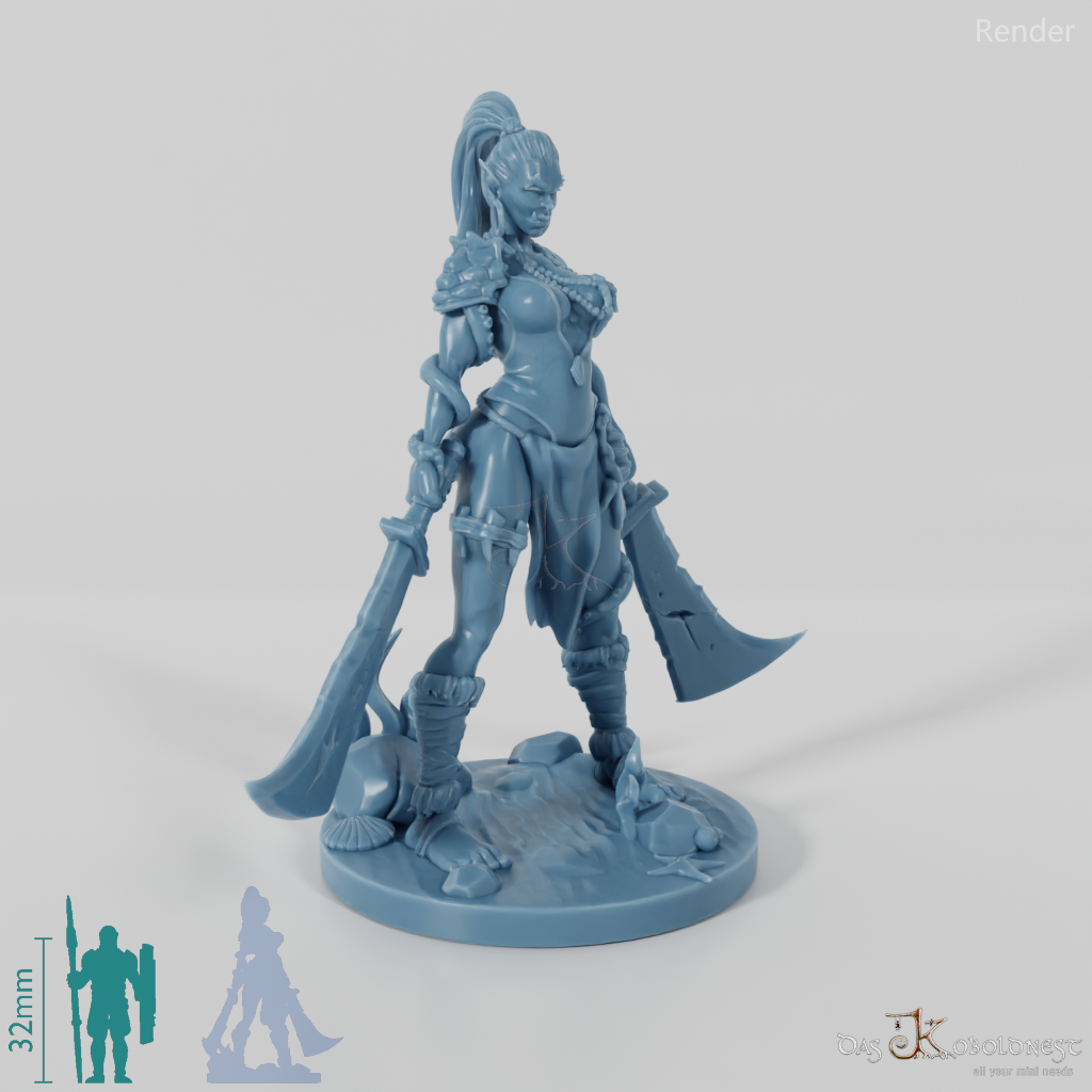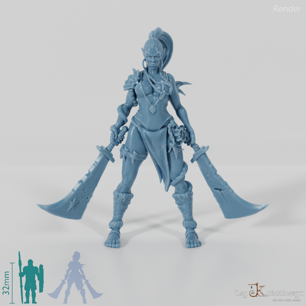 Große Orkfrau in spärlicher Kleidung, die mit zwei großen Schwertern bewaffnet ist. Modell wahlweise mit szenischer 25mm-Rundbase verfügbar