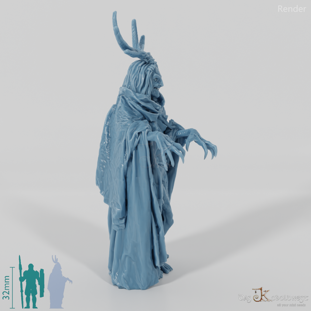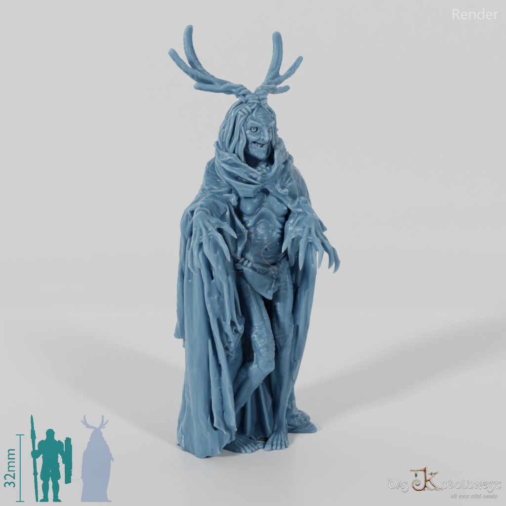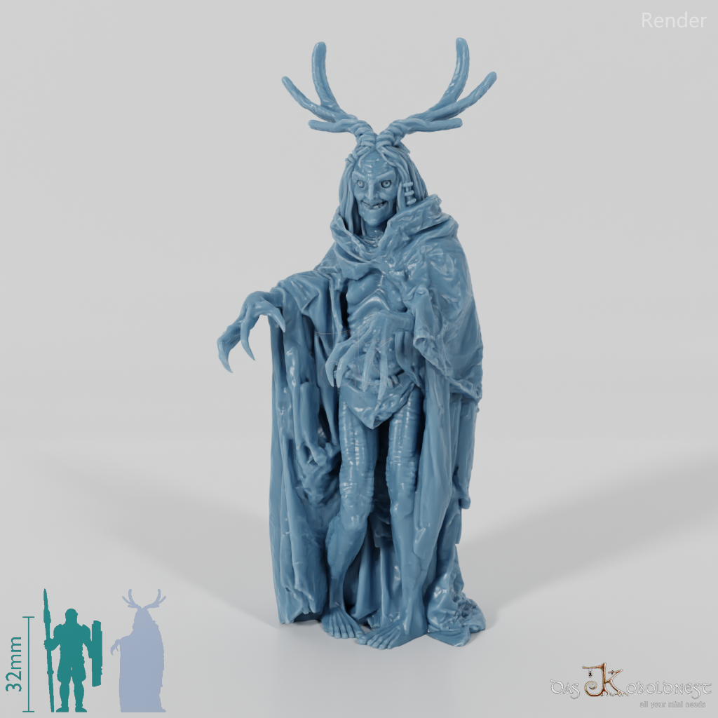 Stehende Hexe mit faltiger Haut, Geweih und Klauenhänden.