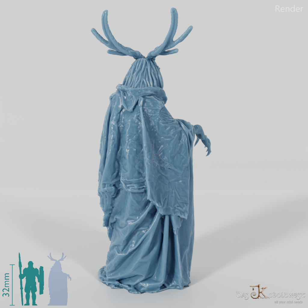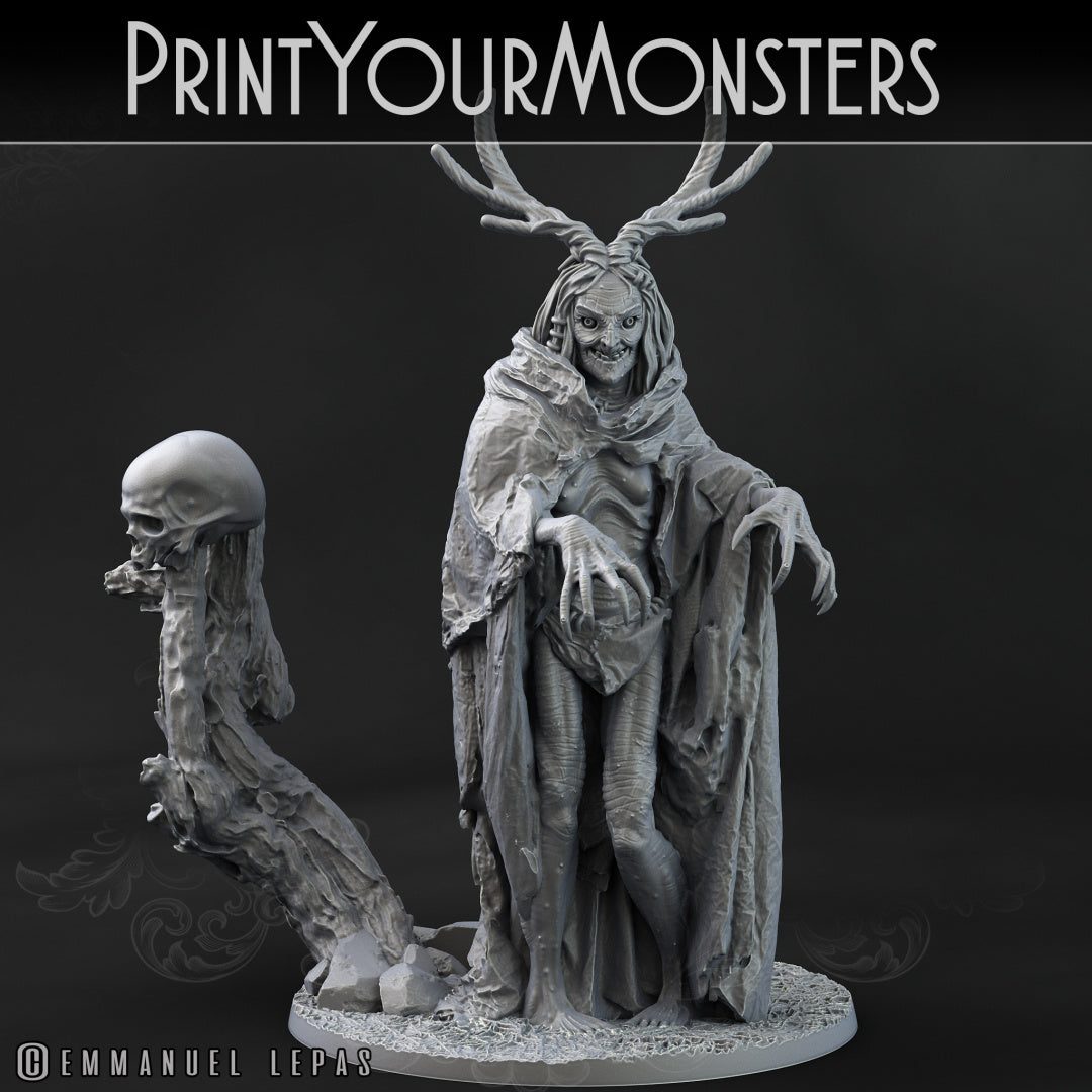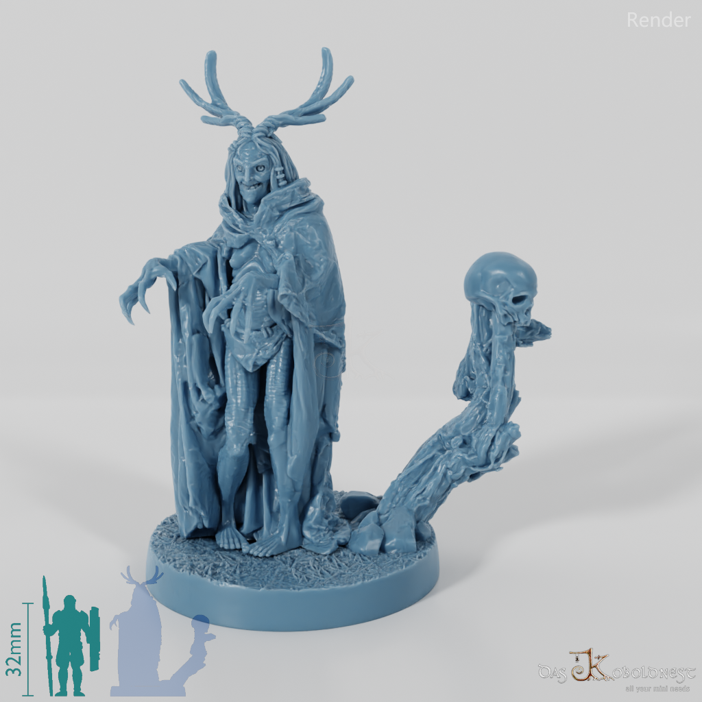 Stehende Hexe mit faltiger Haut, Geweih und Klauenhänden.