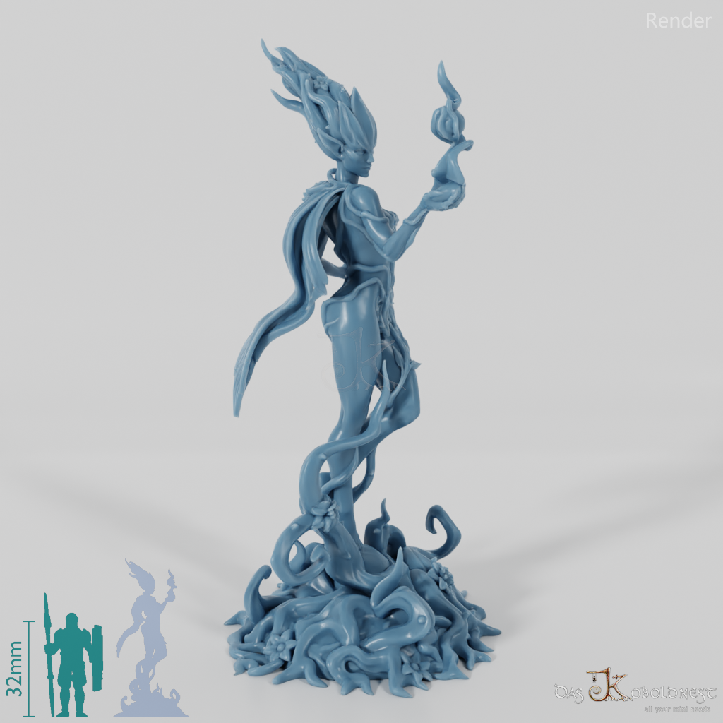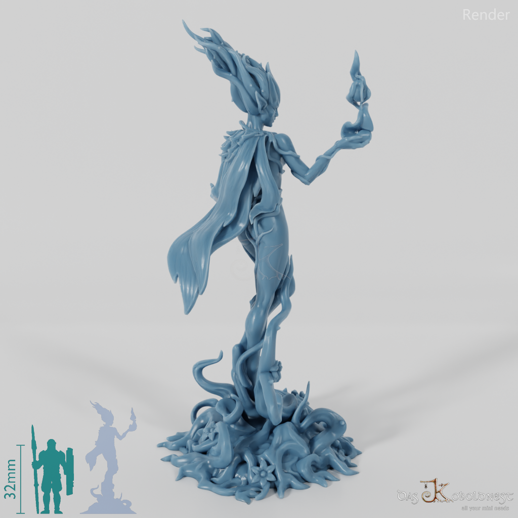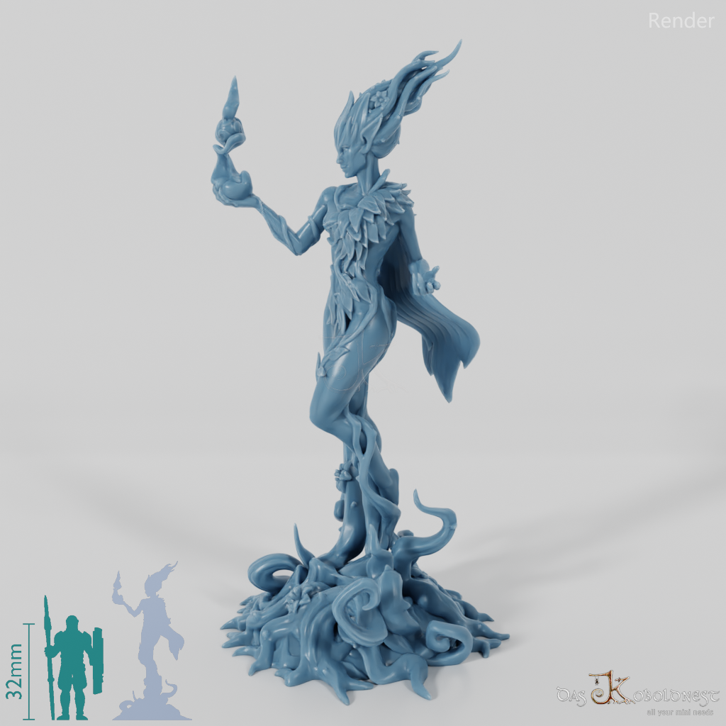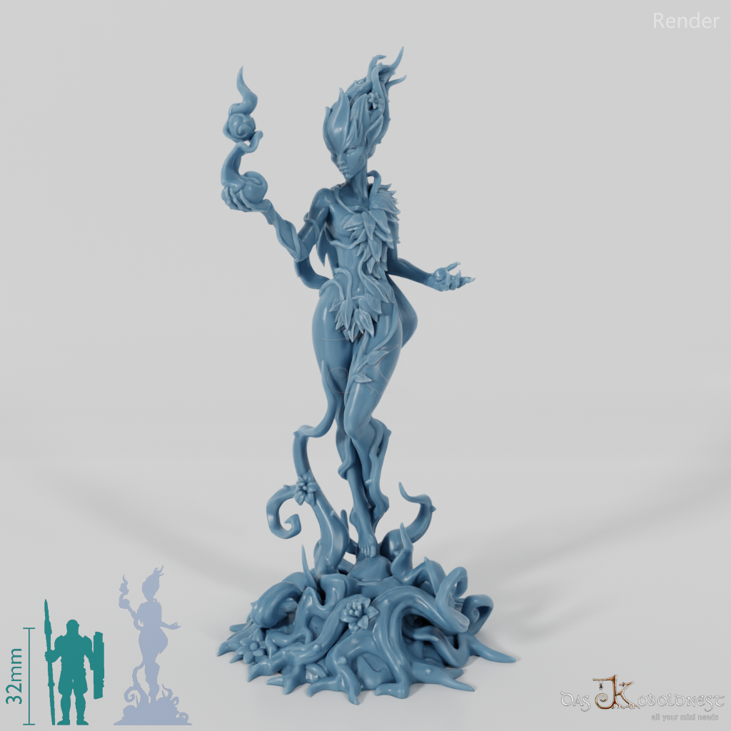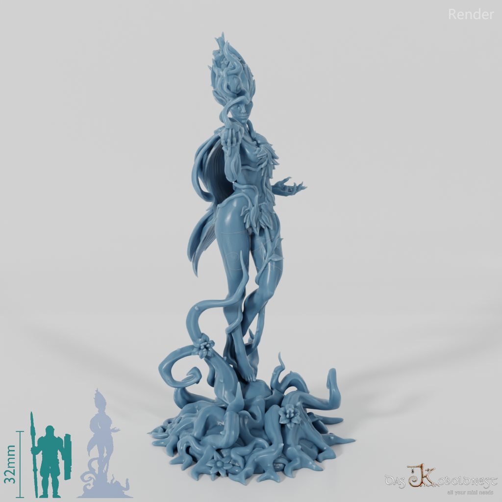 Hoch aufragende, halb pflanzliche, halb menschliche Gestalt, die sich aus einem Gewirr aus Ranken erhebt