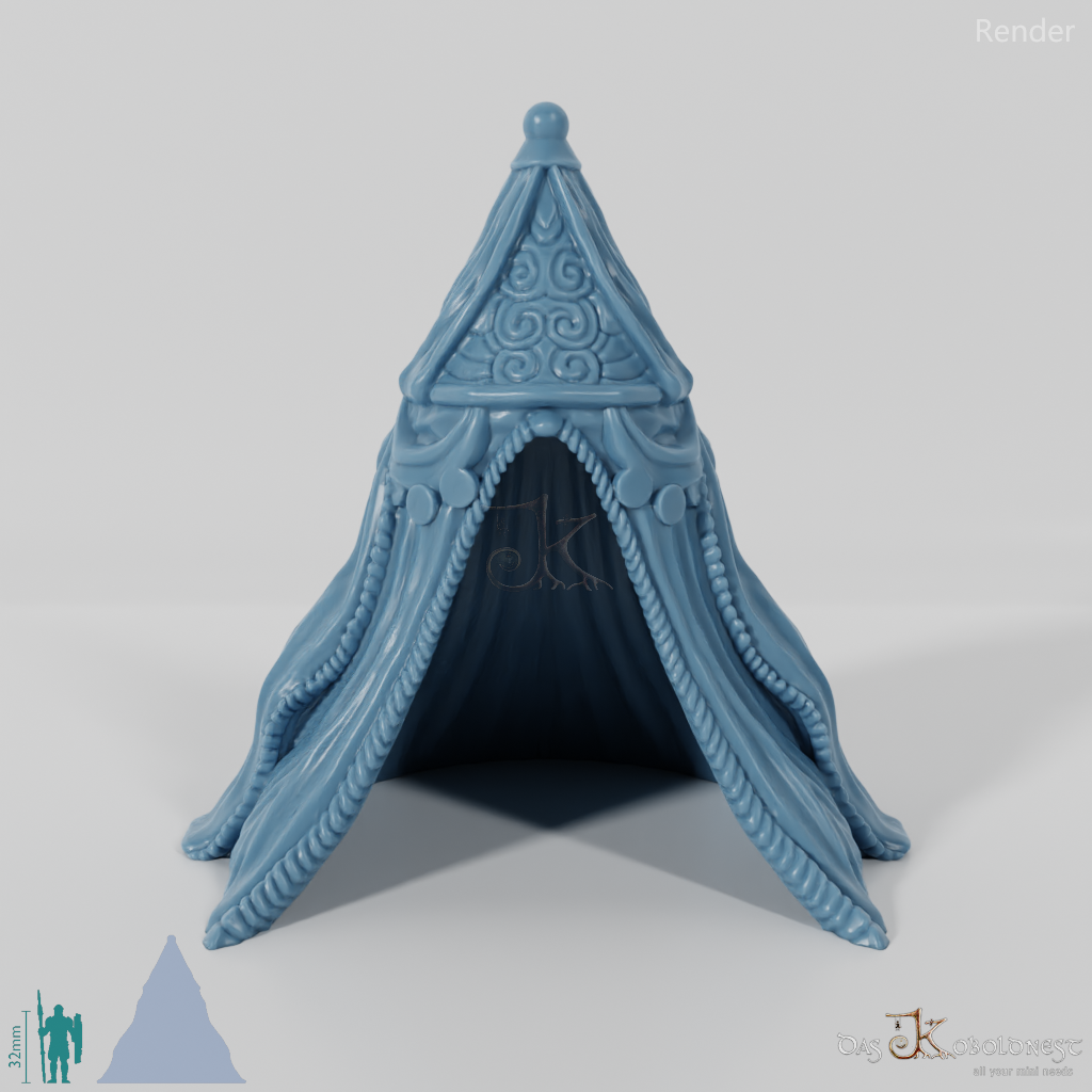 Kleines, offenes Zelt aus verzierten Stoffbahnen.