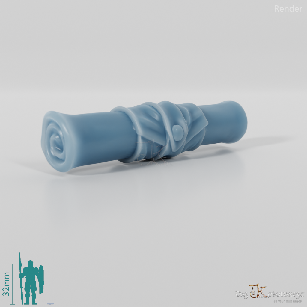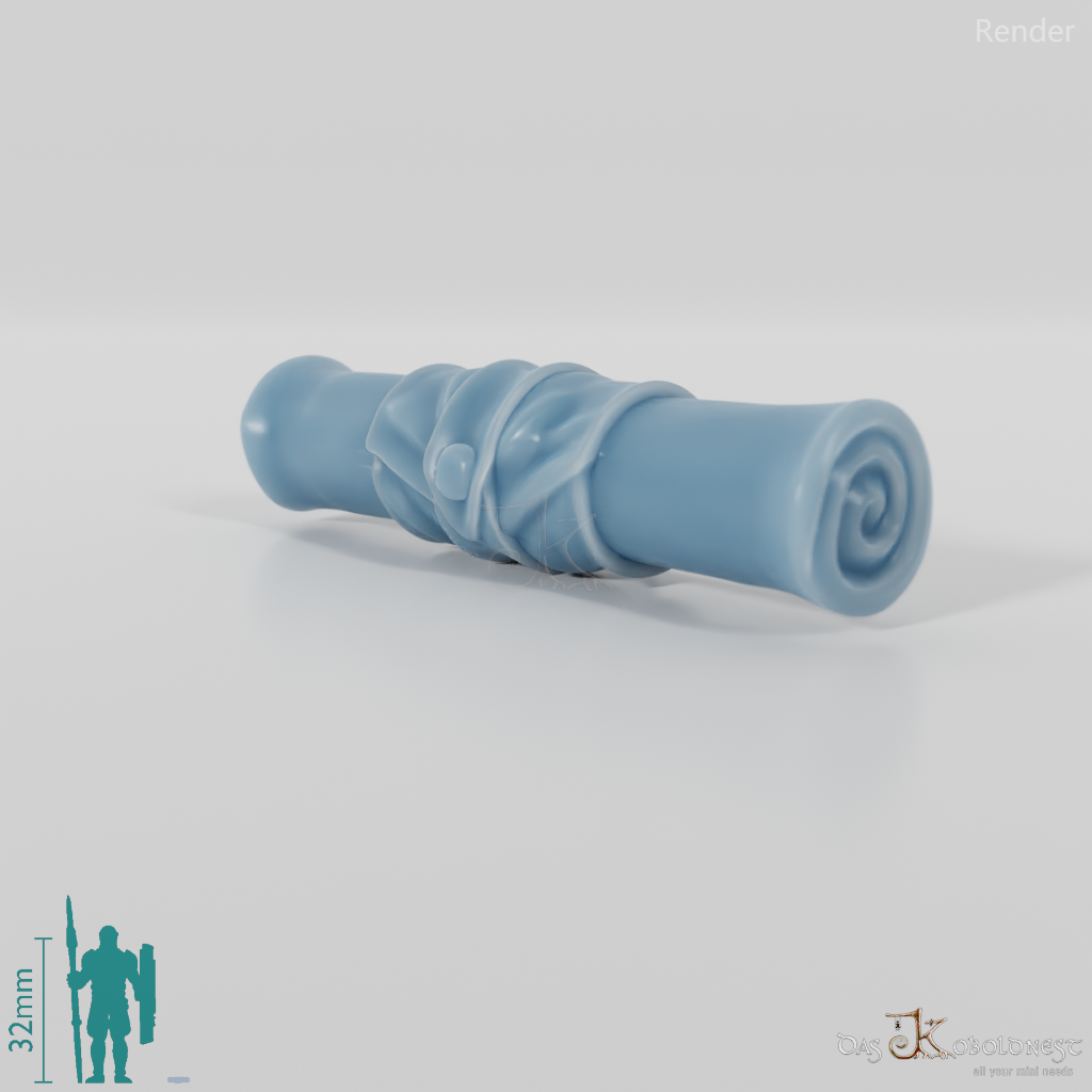 Zusammengerollte Schriftrolle. Das Modell kann beliebig mit allen modularen Körpern der Reihe "Die Armee der Toten" kombiniert werden. Im Customizer von The Printing Goes Ever On kannst du dir selbst eine Vorschau deiner modularen Geisterarmee erstellen und die perfekten Kombinationen für dich finden.