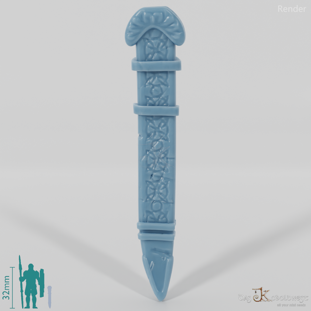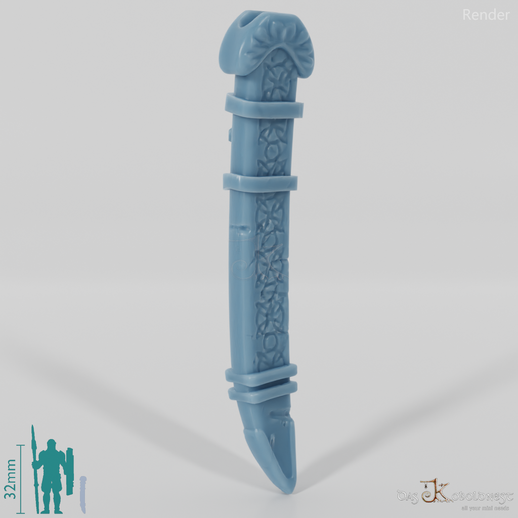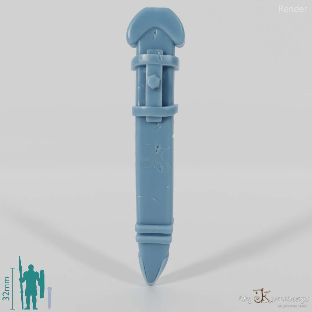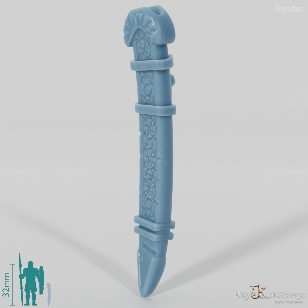 Abgewetzte, vernarbte Schwertscheide. Das Modell kann beliebig mit allen modularen Körpern der Reihe "Die Armee der Toten" kombiniert werden. Im Customizer von The Printing Goes Ever On kannst du dir selbst eine Vorschau deiner modularen Geisterarmee erstellen und die perfekten Kombinationen für dich finden.