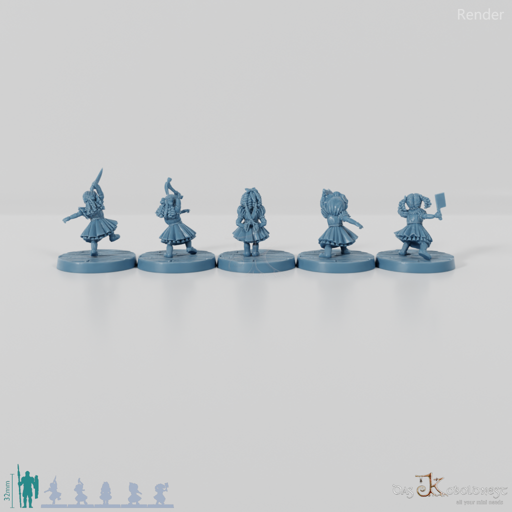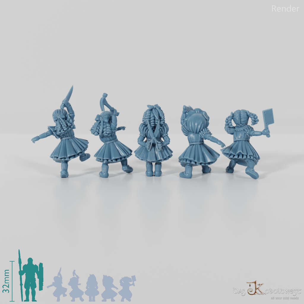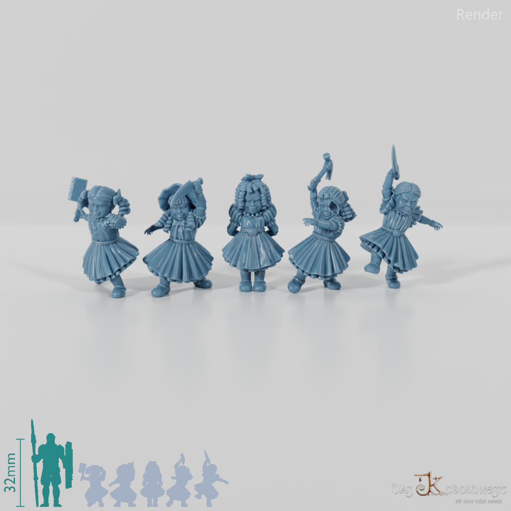 Fünf unterschiedliche, lockenköpfige Puppen, die mit verschiedenen Waffen bewaffnet sind. Modelle wahlweise mit oder ohne gestaltete 25mm-Base verfügbar.