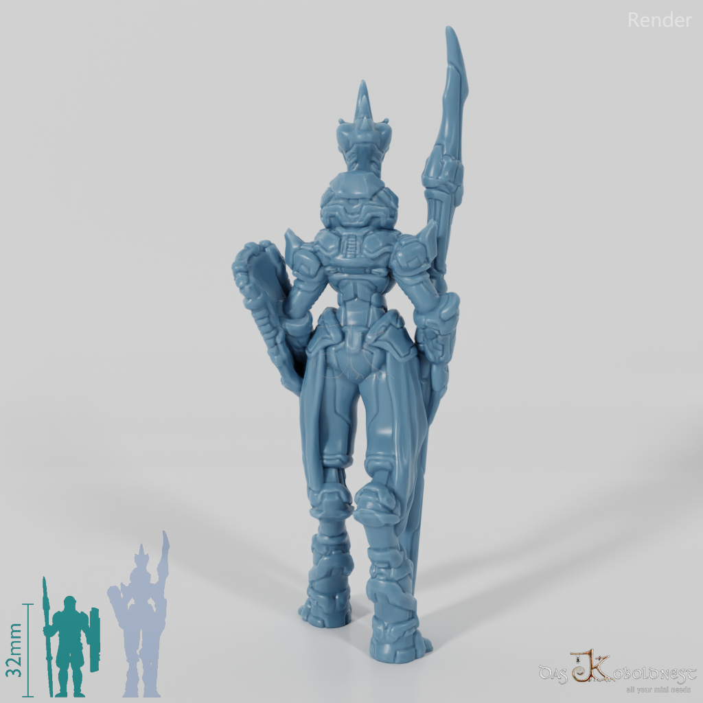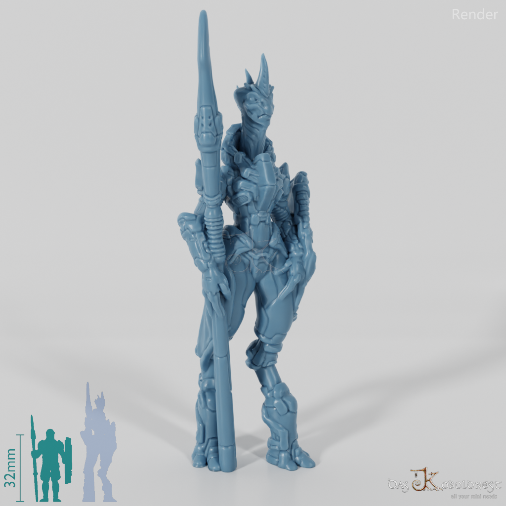 Hochgewachsener Außerirdischer in Rüstung mit großer Stangenwaffe in einer und Schild in der anderen Hand.