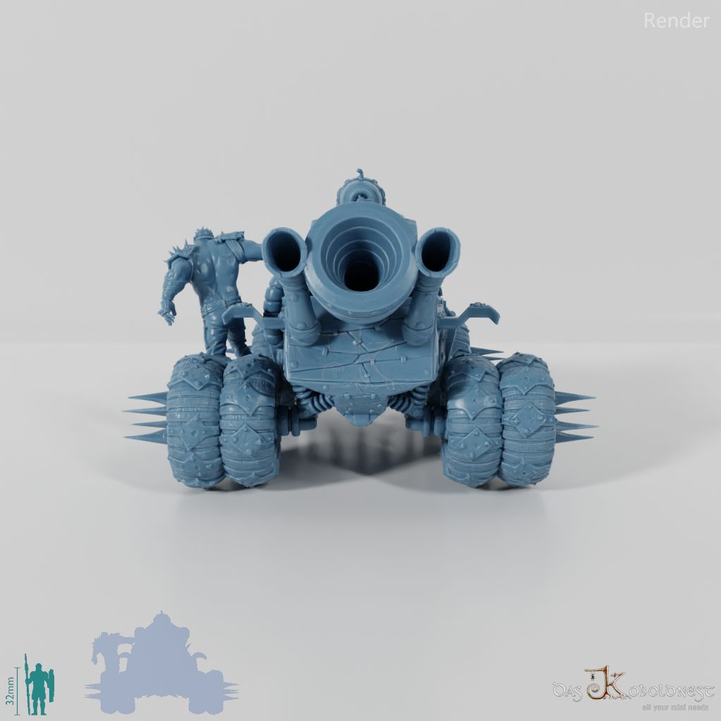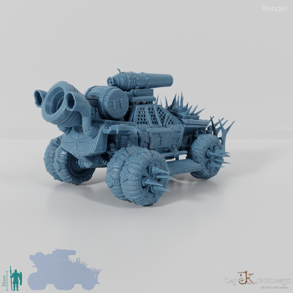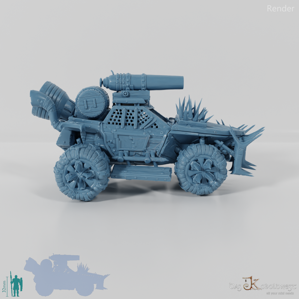 Aus Metallschrott und Holzresten zusammengebautes Auto mit stachelbewehrter Rüstung, riesigem Auspuff und auf dem Dach montierter Kanone und großem, oberkörperfreiem Mann, der sich außen an der Fahrerseite festhält