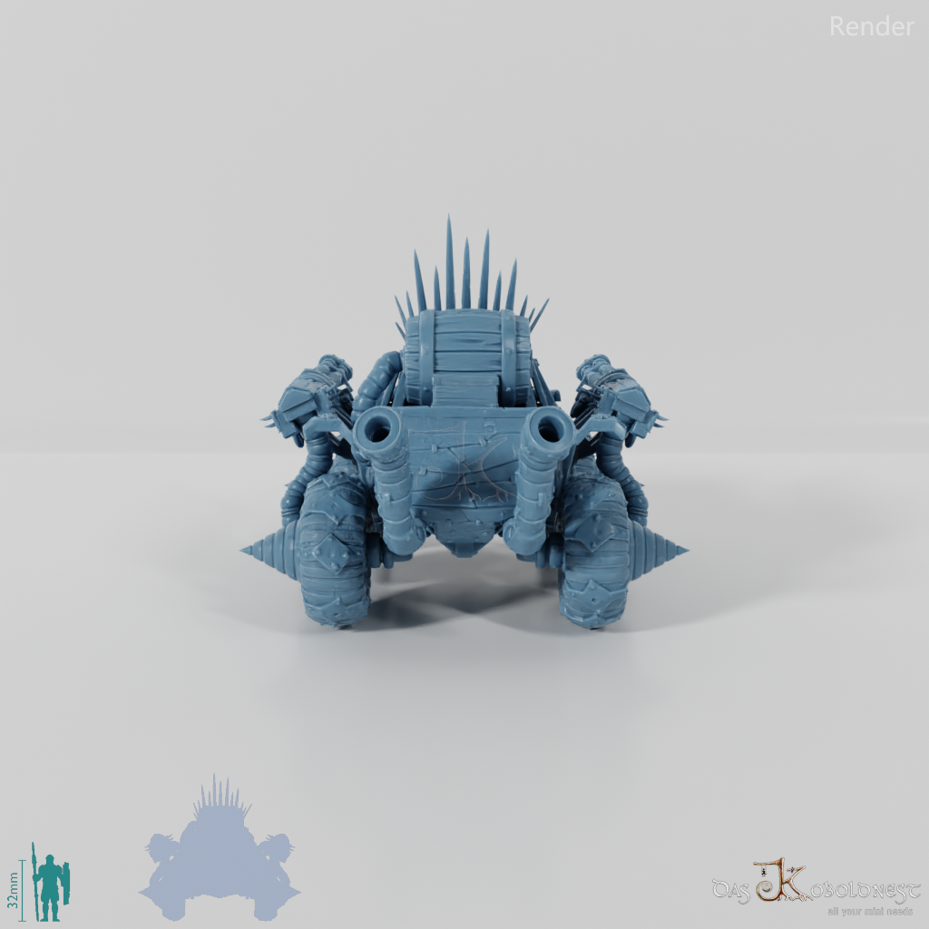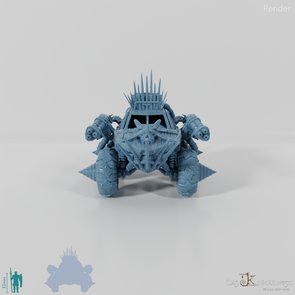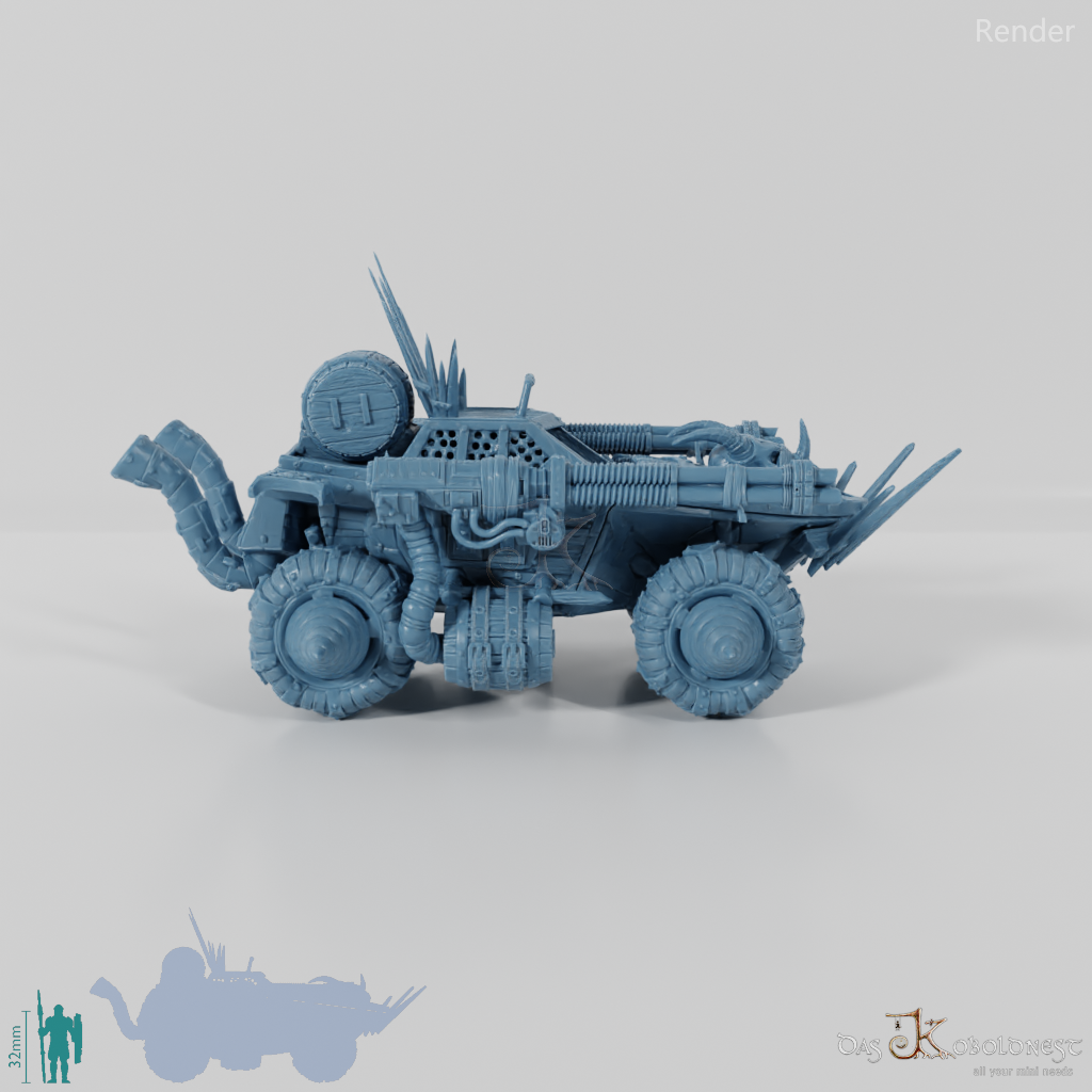 Aus Metallschrott und Holzresten zusammengebautes Auto mit stachelbewehrter Rüstung und zwei mehrläufigen Geschützen an der Seite