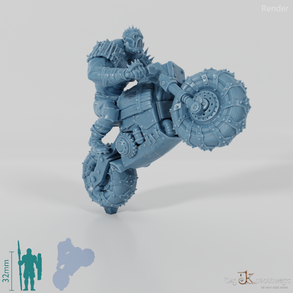 Oberkörperfreier, muskulöser Mann mit Gasmaske und dorniger Metallrüstung, der auf einem zusammengeflickten Motorrad fährt
