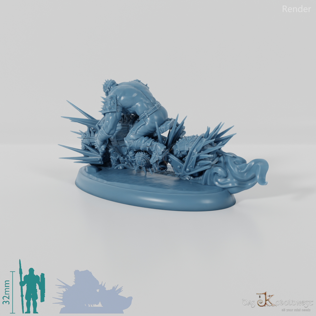 Oberkörperfreier, muskulöser Mann mit Gasmaske und dorniger Metallrüstung, der auf einem zusammengeflickten Motorrad fährt