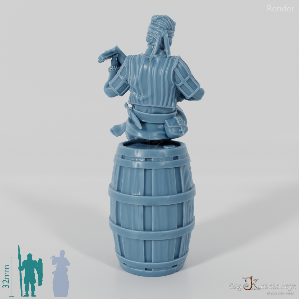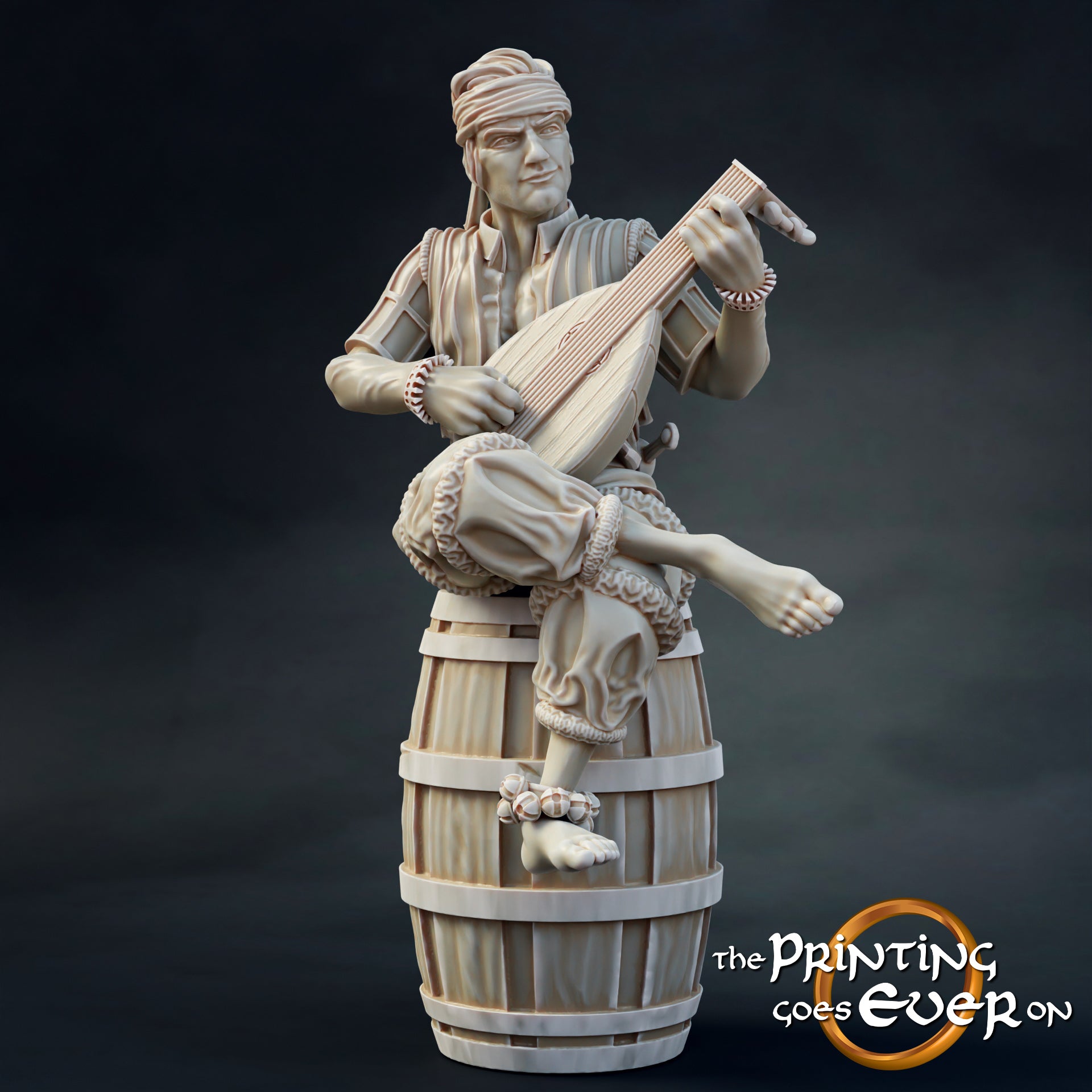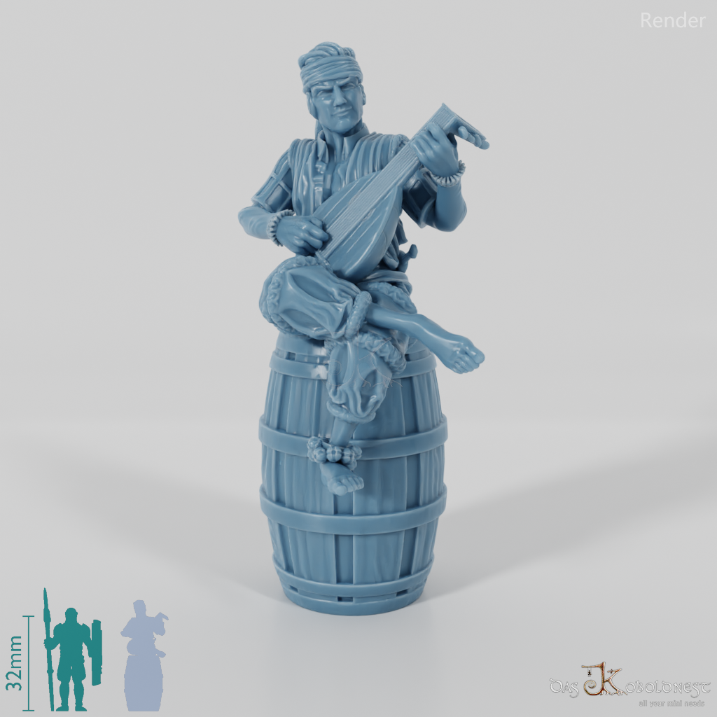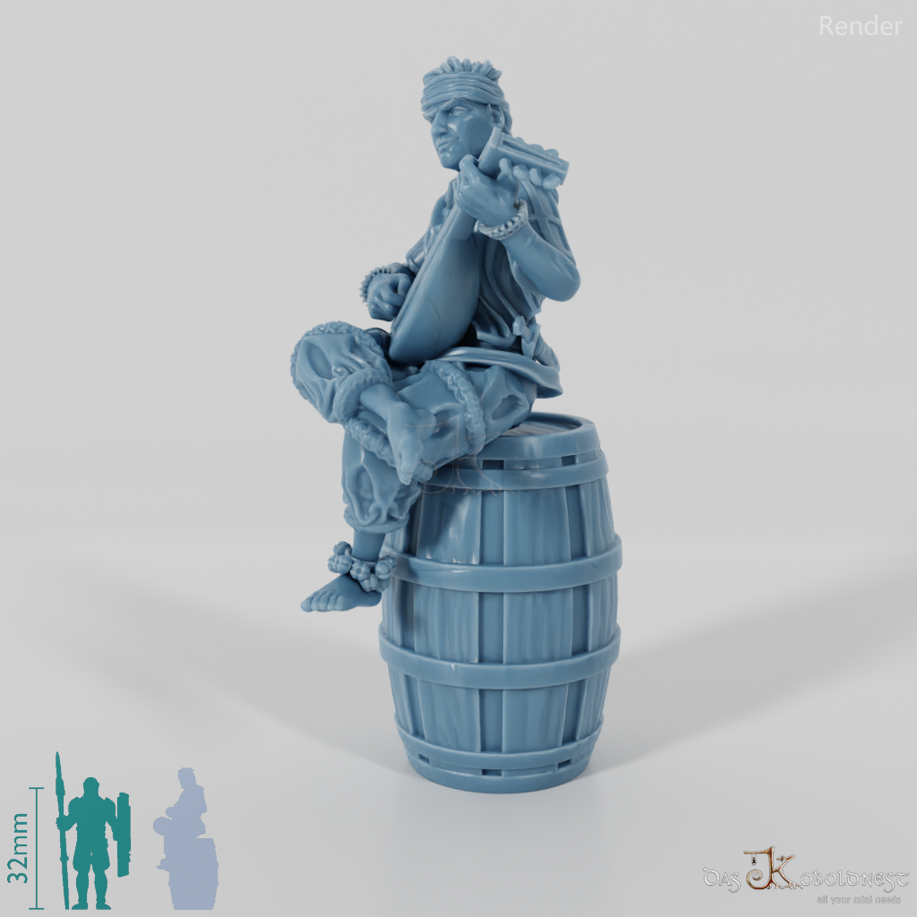 Musikant in verzierter Stoffkleidung, der auf einem Fass sitzt und ein Saiteninstrument spielt