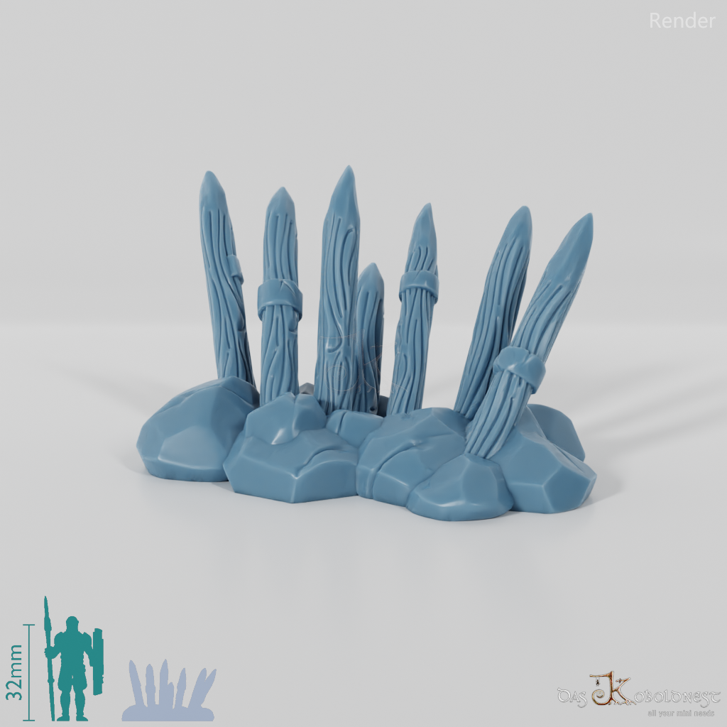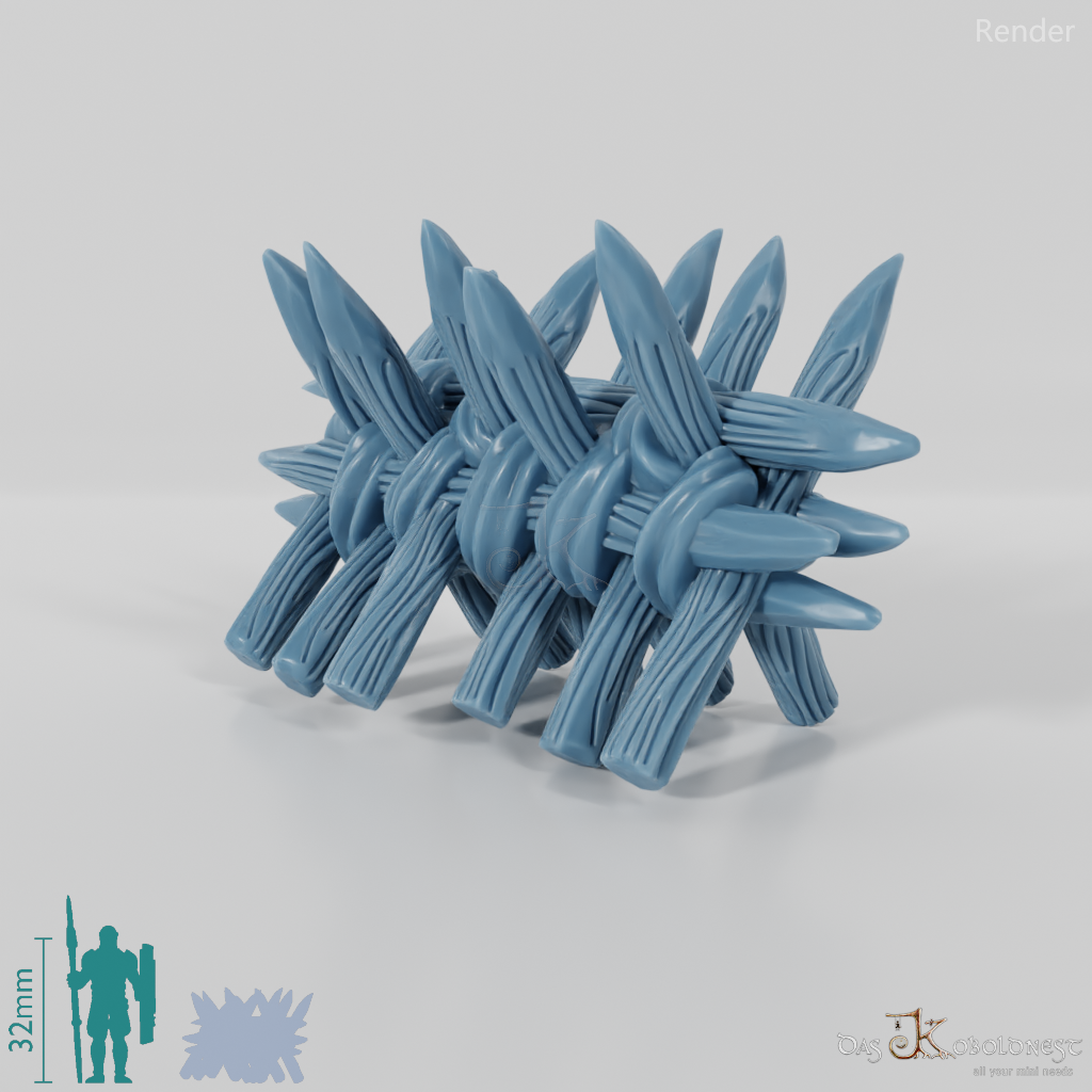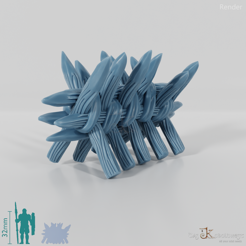 Angespitzte Holzpfähle zur Abwehr von Angreifern. Zwei verschiedene Modelle verfügbar: