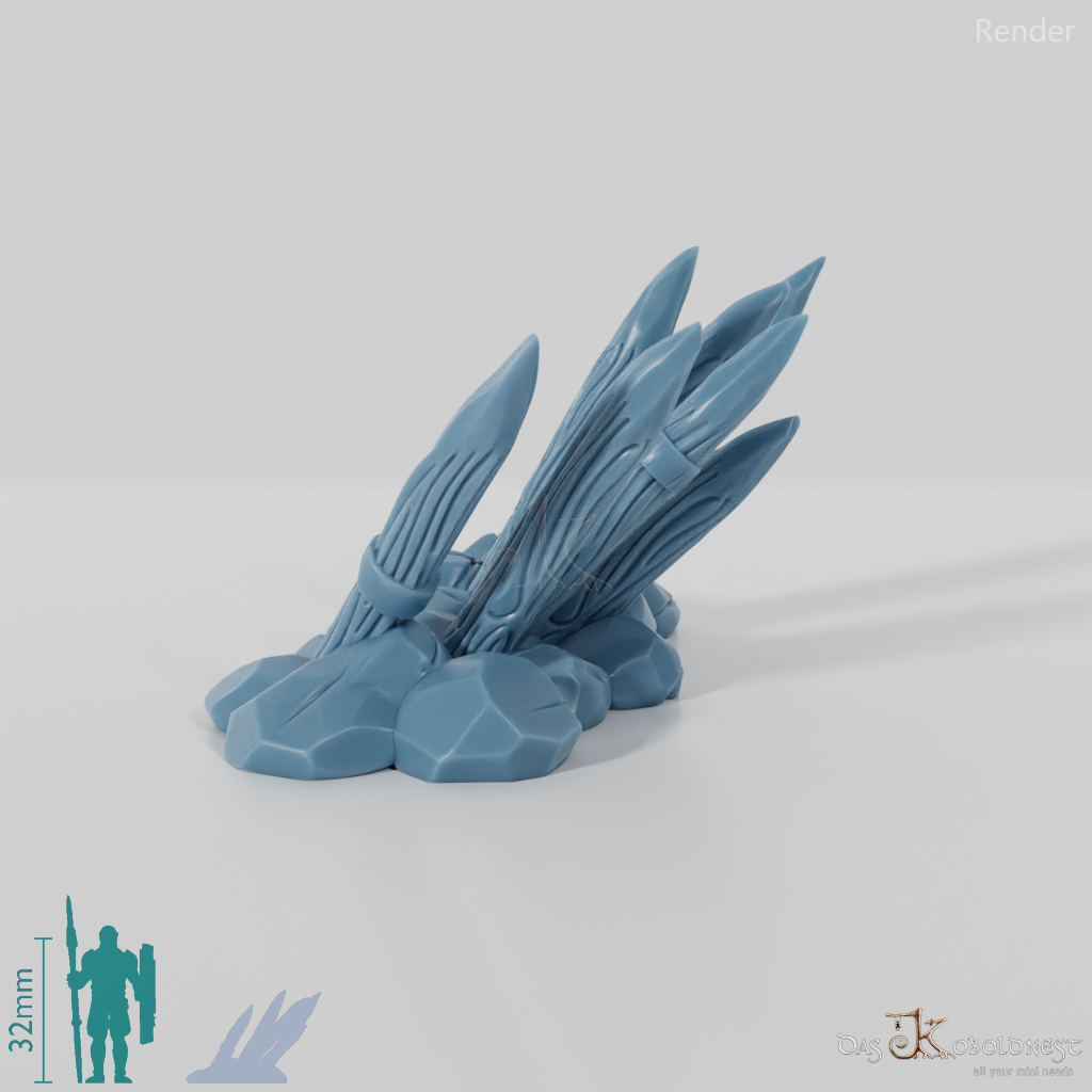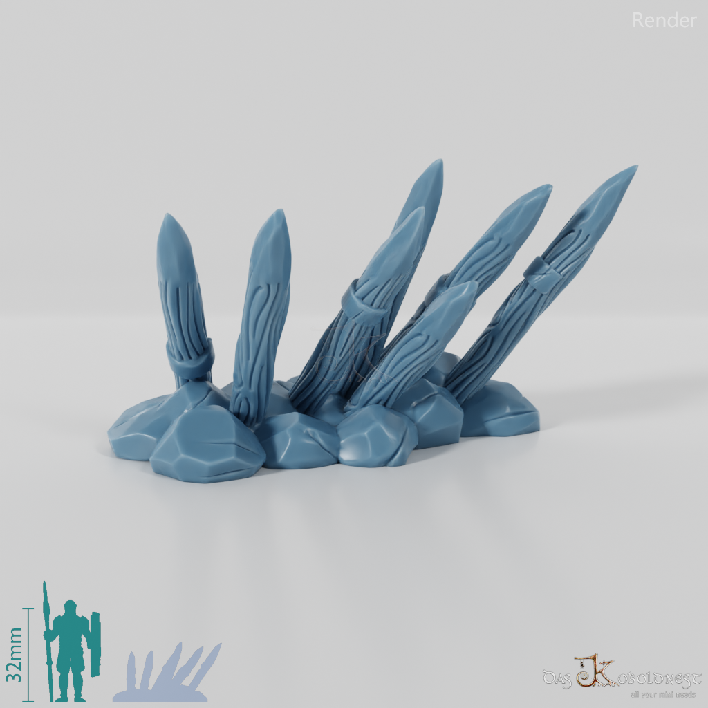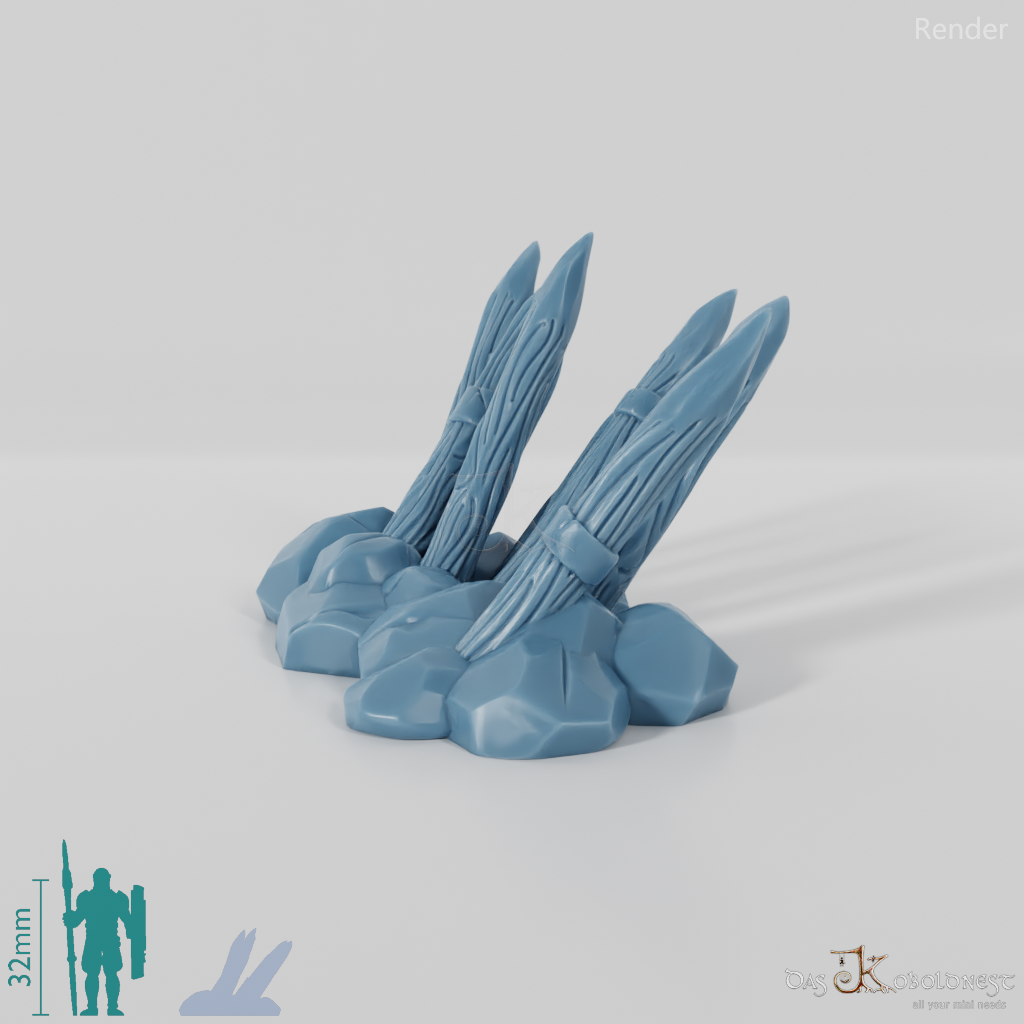 Angespitzte Holzpfähle zur Abwehr von Angreifern. Zwei verschiedene Modelle verfügbar: