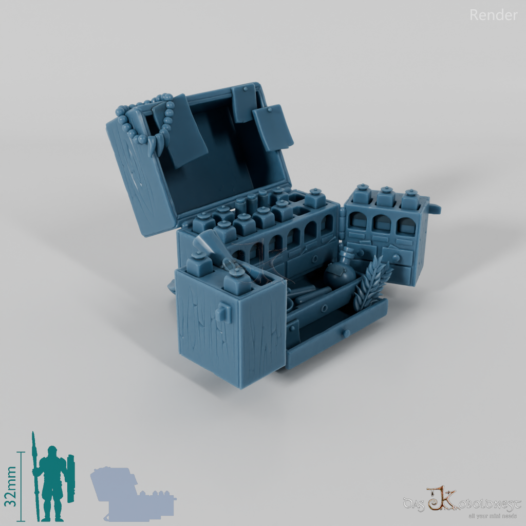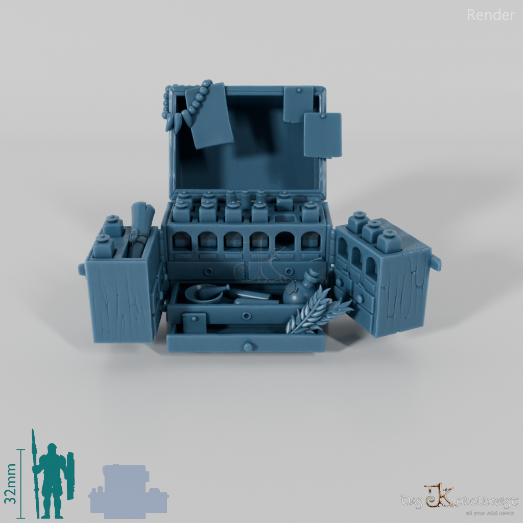 Dieser aufgeklappte Alchemiekoffer, reich bestückt mit Tiegel, Fläschchen und einer Vielfalt an geheimnisvollen Zutaten, ist ein absolutes Muss für jedes Alchemistenlabor. Die Detailtreue, mit der jeder Gegenstand im Koffer dargestellt ist, macht ihn zu einem faszinierenden Stück, das Geschichten von unerforschten Tränken und alchemistischen Experimenten erzählt.