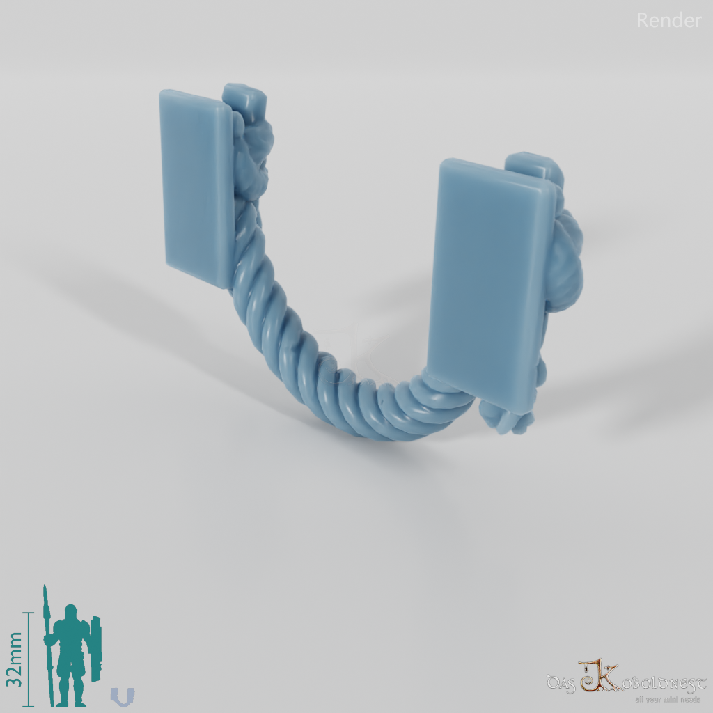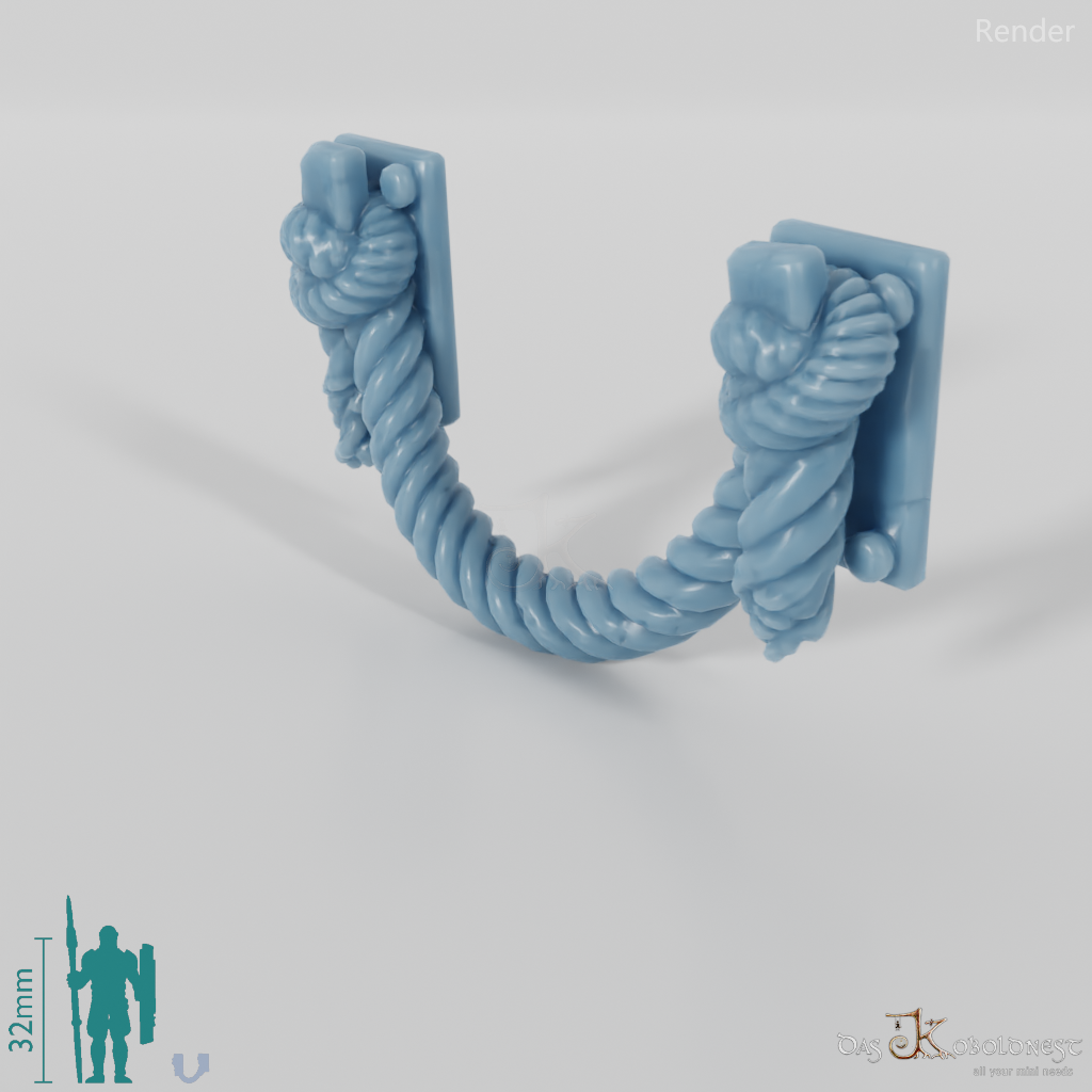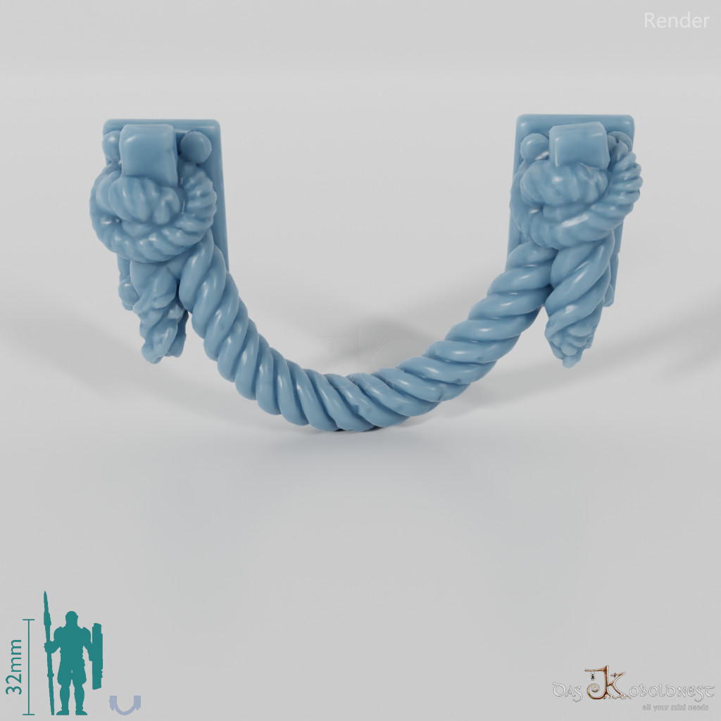 An zwei Metallstreifen verknotetes Seil mit abgerissenen Enden, das an Kisten, Truhen oder anderen Gegenständen befestigt werden kann