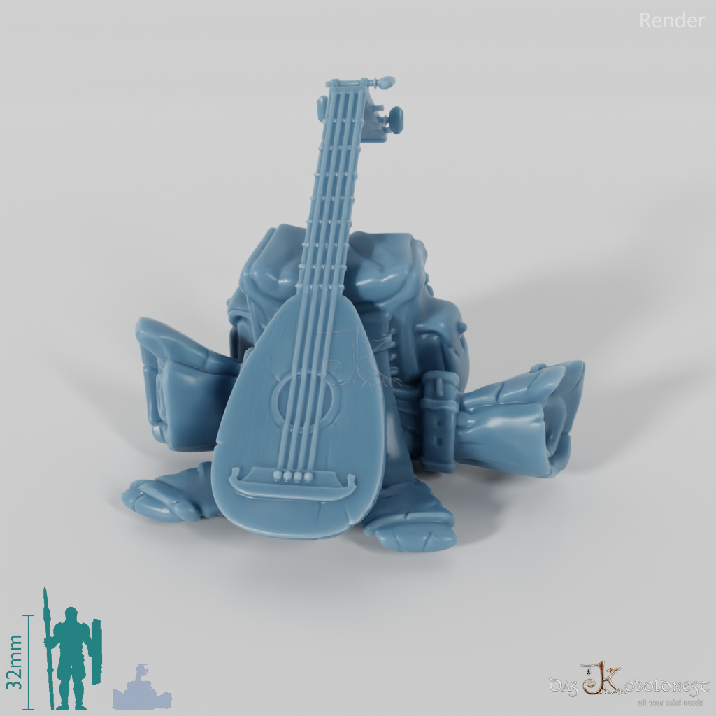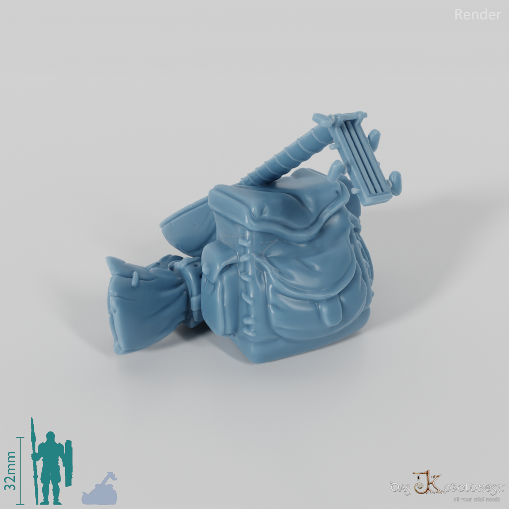 Aufrecht stehender Rucksack, an dem eine aufgerollte Lederplane und eine Laute lehnen