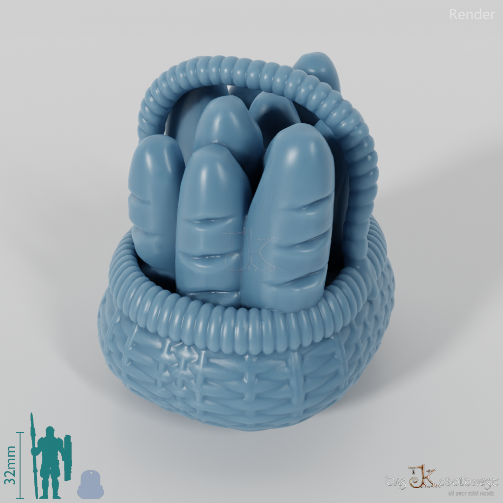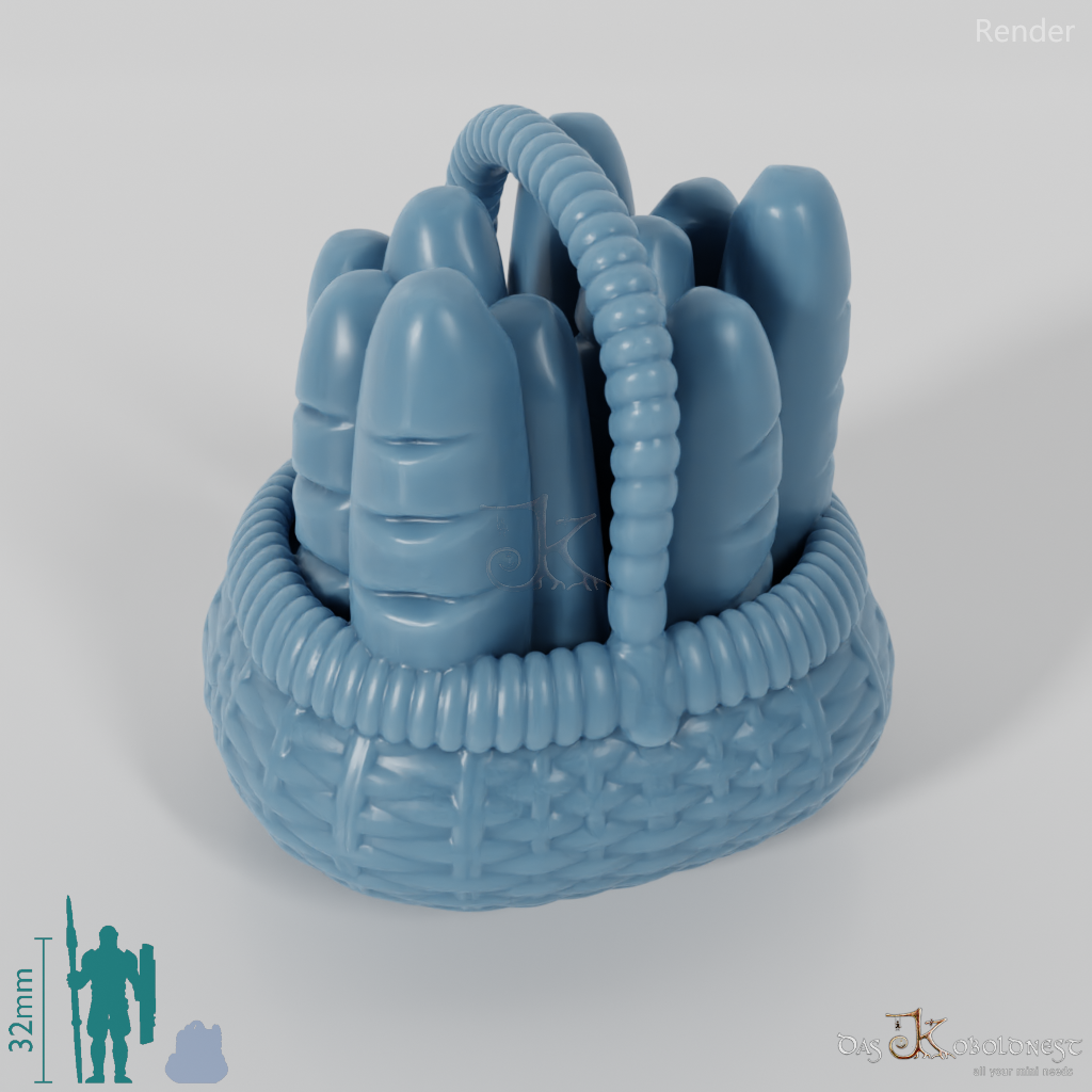 Korb mit Henkel, in dem zehn längliche Brote aufrecht stehen