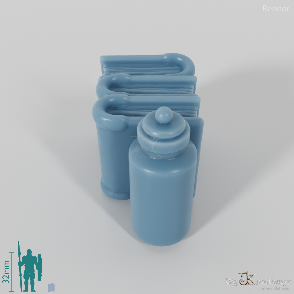 Drei nebeneinanderstehende Bücher, die an ein kleines Fläschchen gelehnt sind