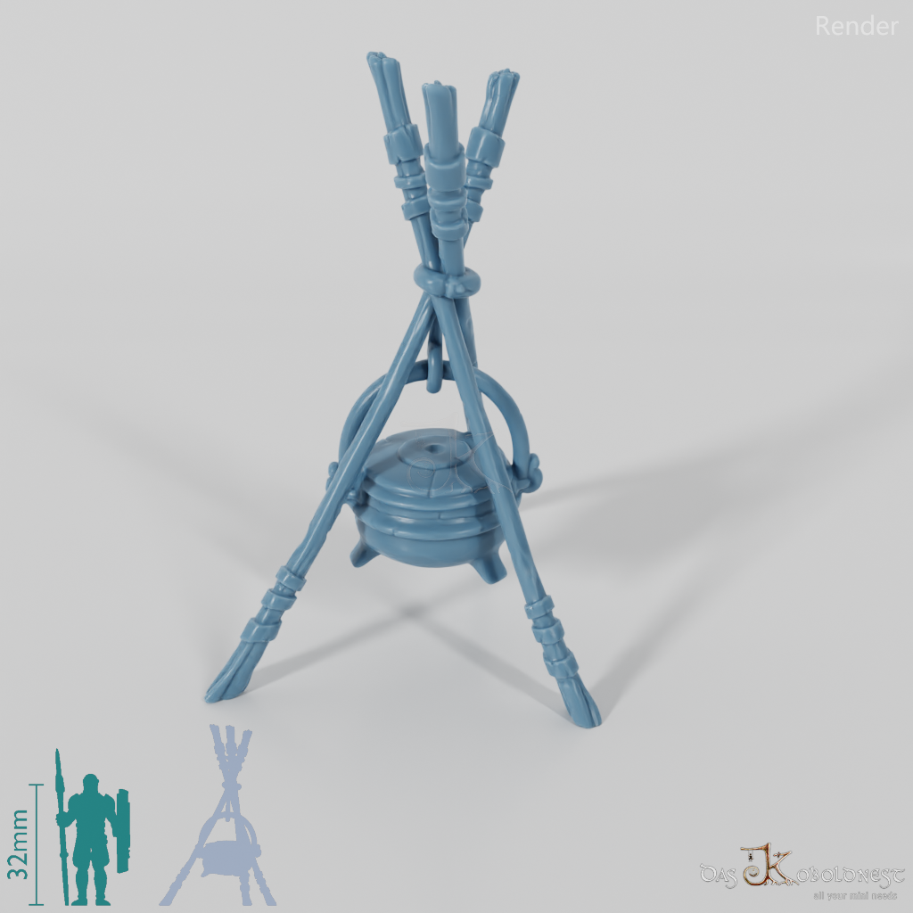 Hohes Holzgestell mit Suppentopf, das zum Braten von Nahrung über ein Feuer gestellt werden kann