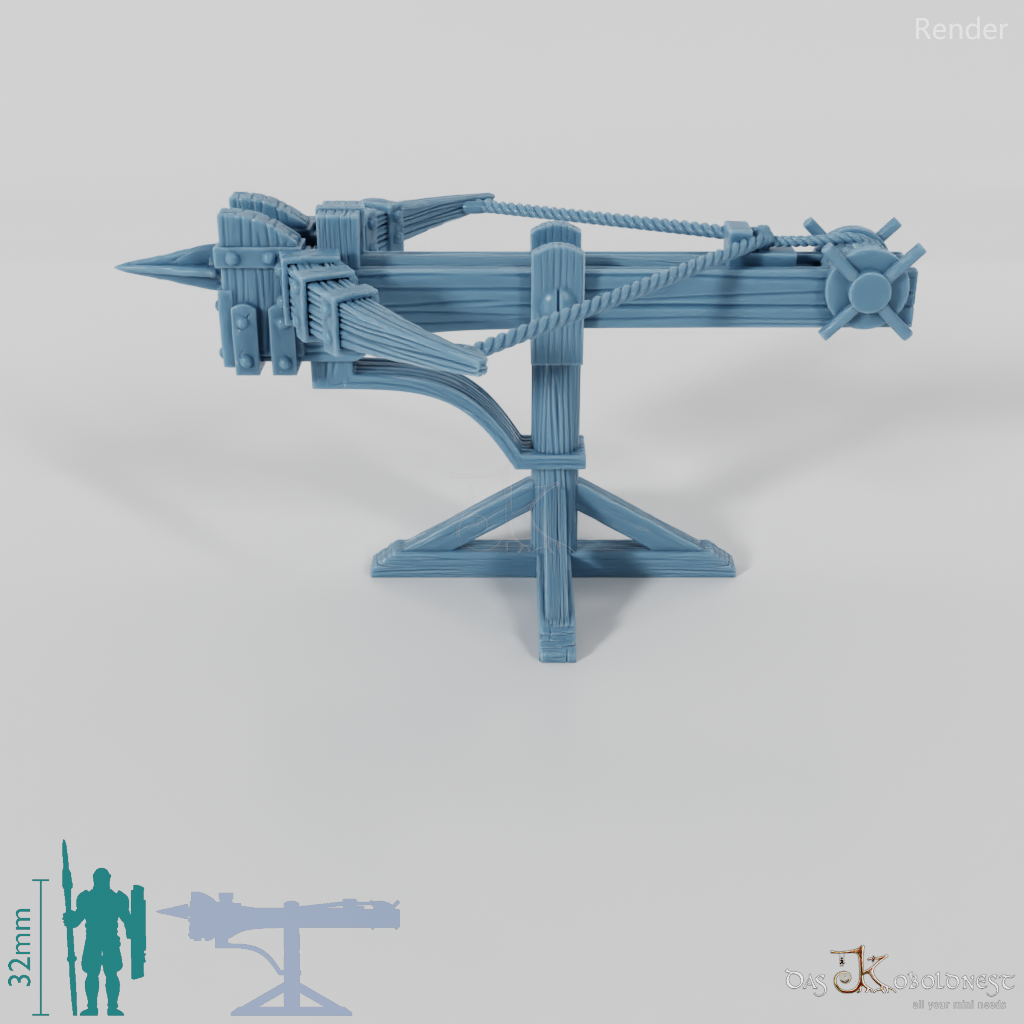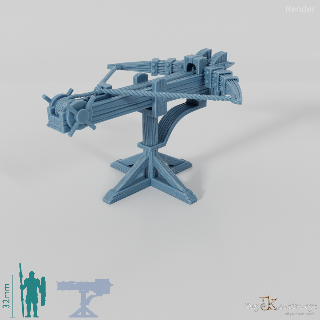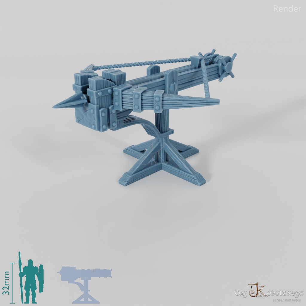 Gespannter Bolzenwerfer, der auf ein Holzgerüst montiert ist