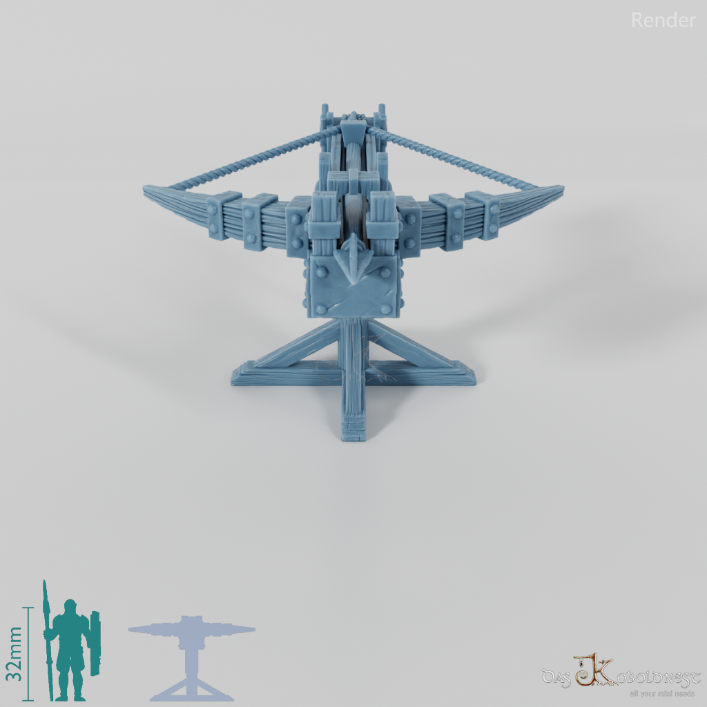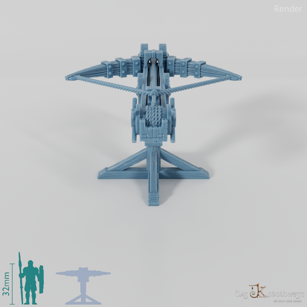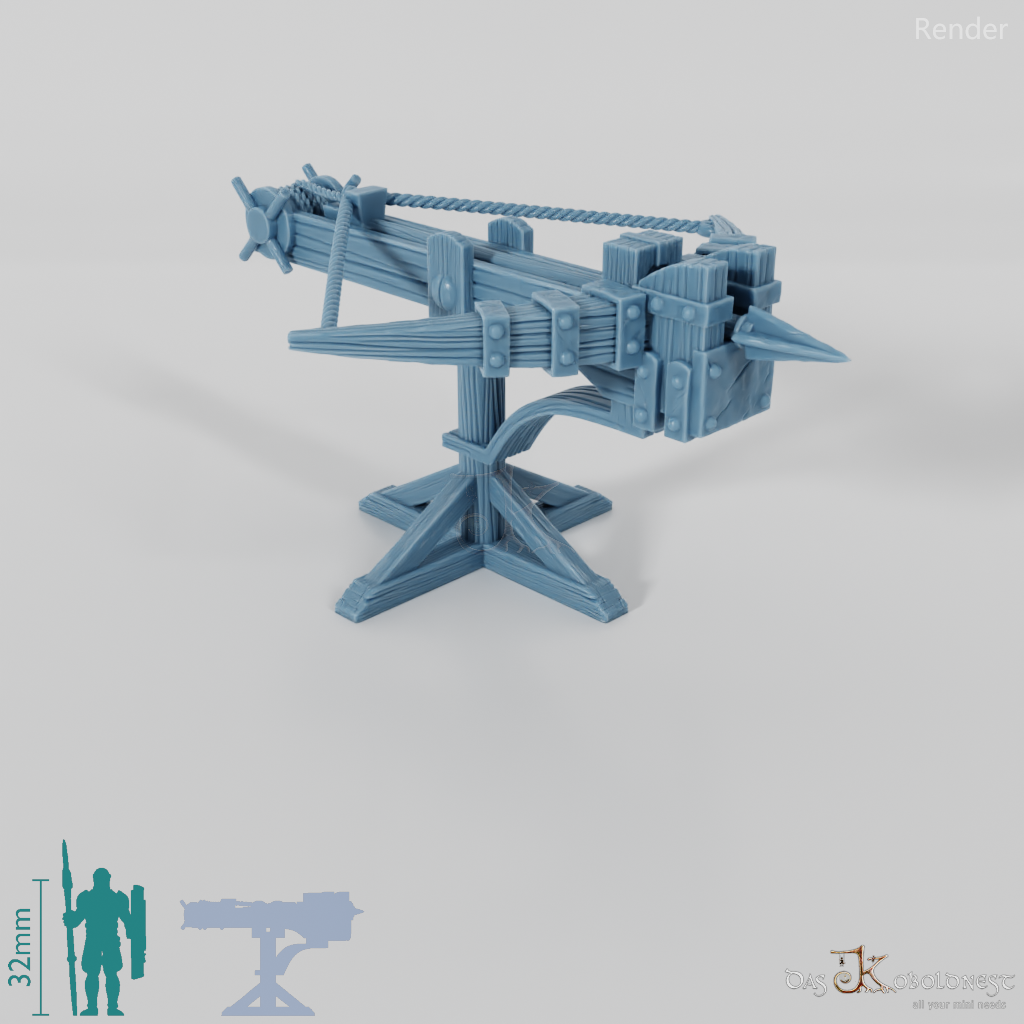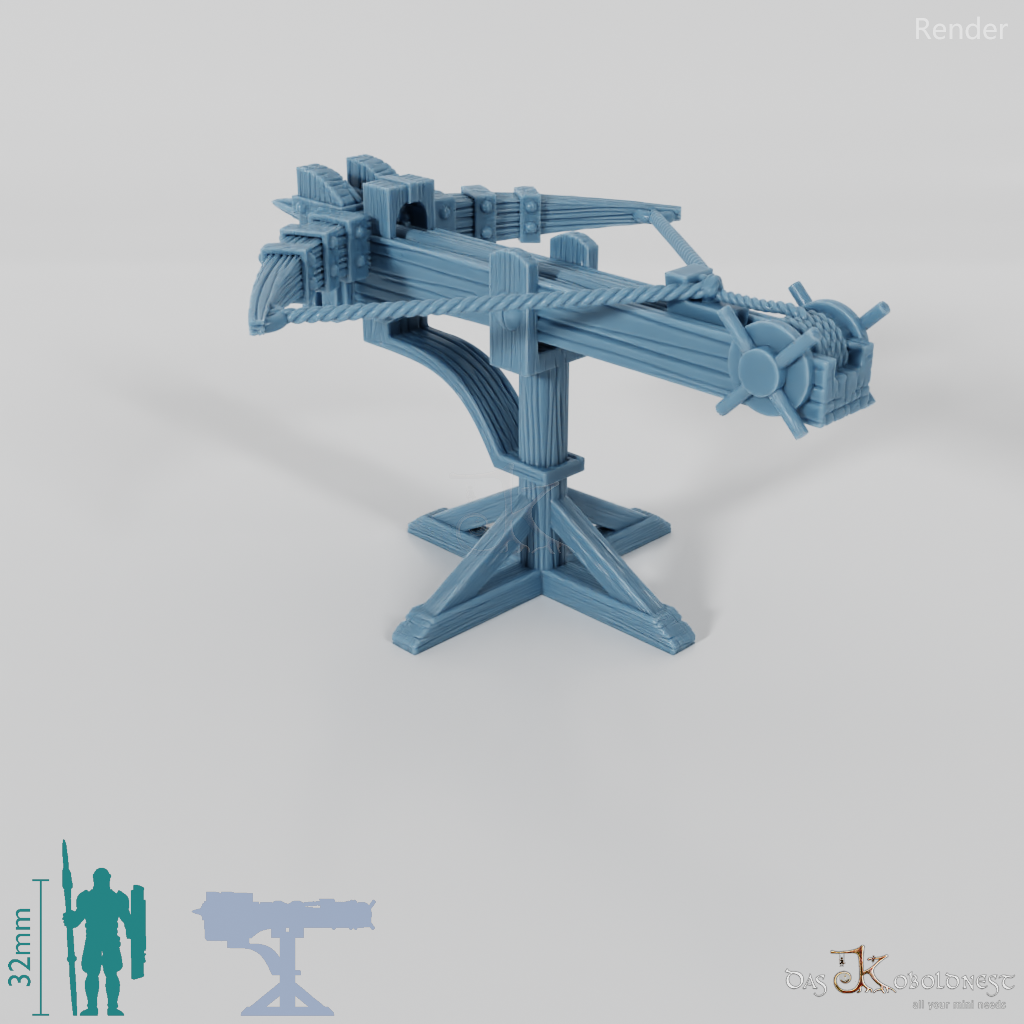 Gespannter Bolzenwerfer, der auf ein Holzgerüst montiert ist