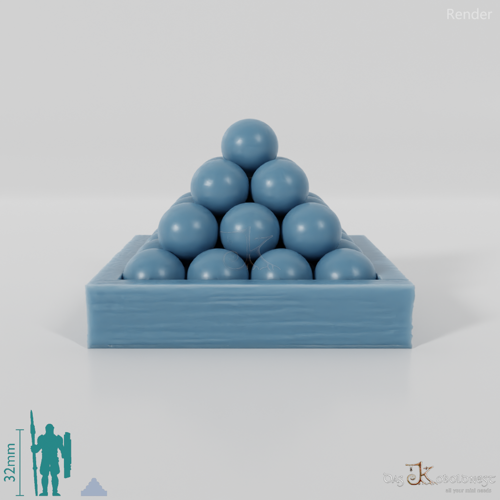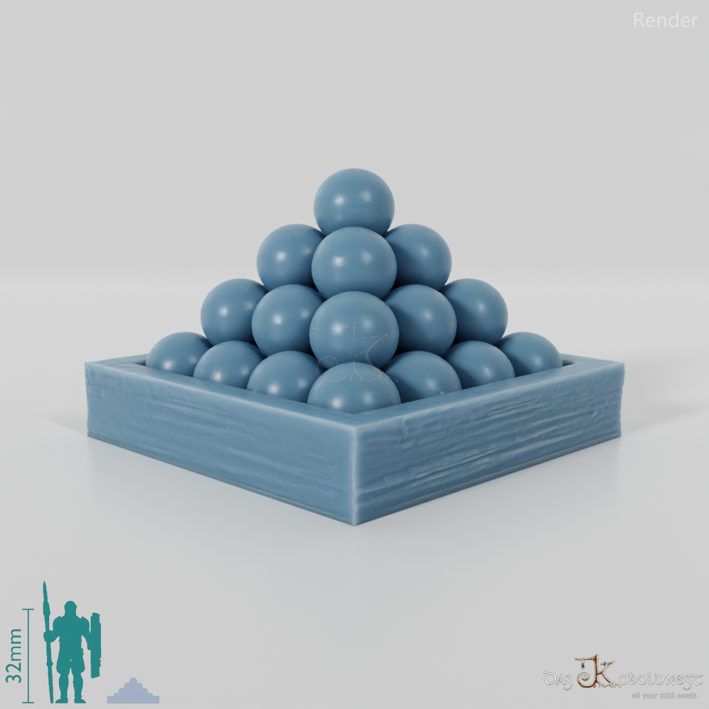Haufen ordentlich gestapelter Kanonenkugeln.   Modell: Cannonballs by tshenry1, lizenziert unter CC BY-SA 3.0.