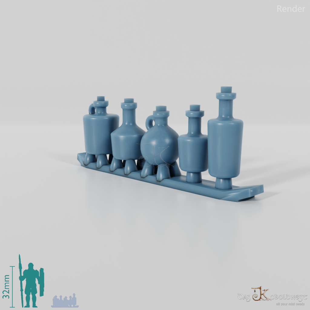 Fünf verschiedene verkorkte Flaschen Die Modelle werden in zusammenhängendem Rahmen geliefert und müssen beispielsweise mit einem Bastelmesser abgetrennt werden. Model by Pellinor1, licensed under CC BY 4.0