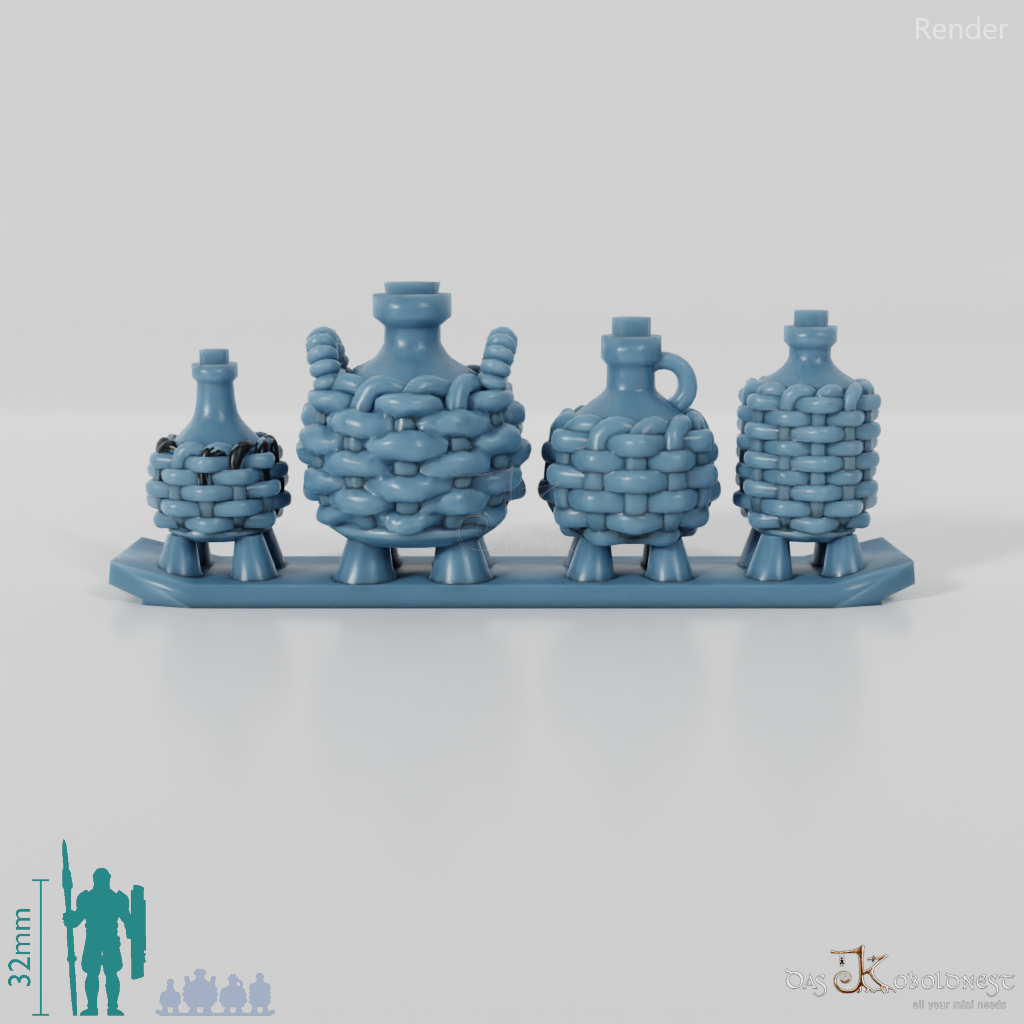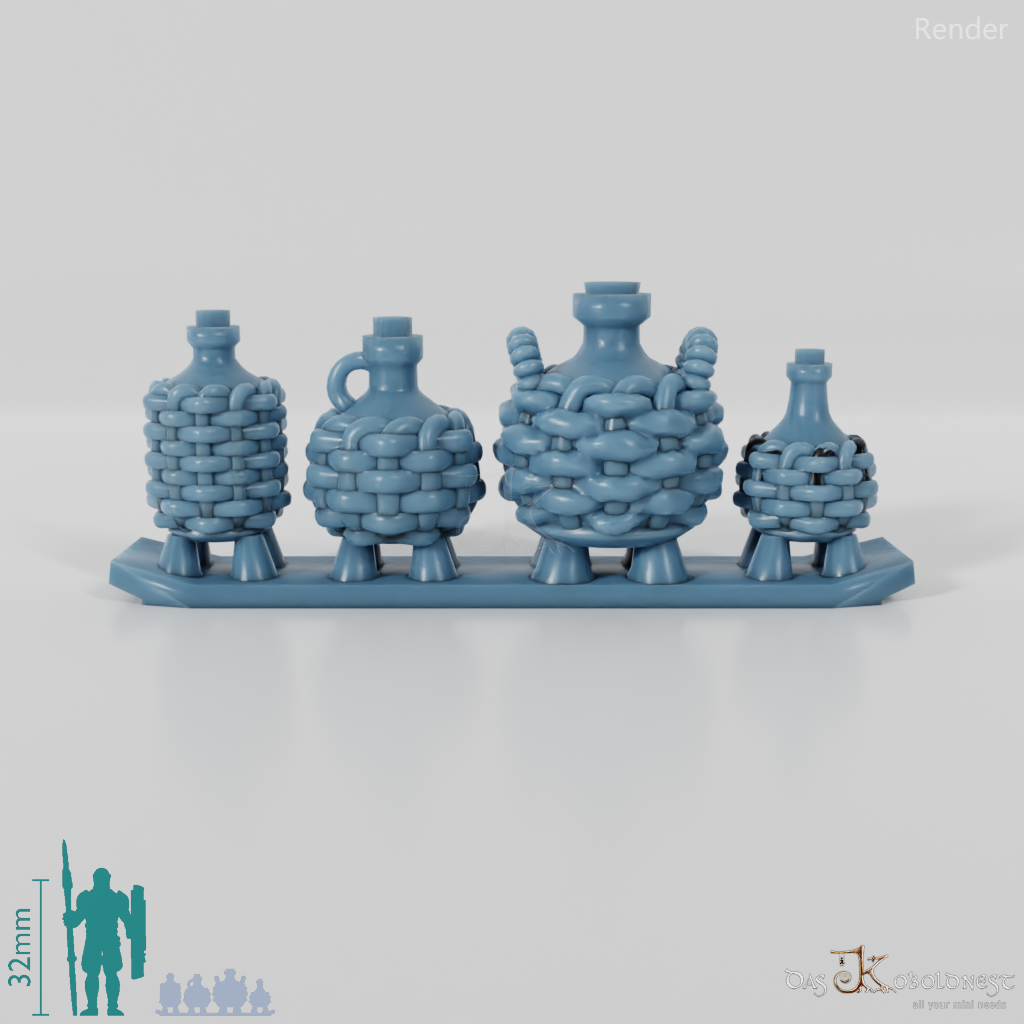 Vier verschiedene runde Flaschen in geflochtenen Körben Die Modelle werden in zusammenhängendem Rahmen geliefert und müssen beispielsweise mit einem Bastelmesser abgetrennt werden. Model by Pellinor1, licensed under CC BY 4.0