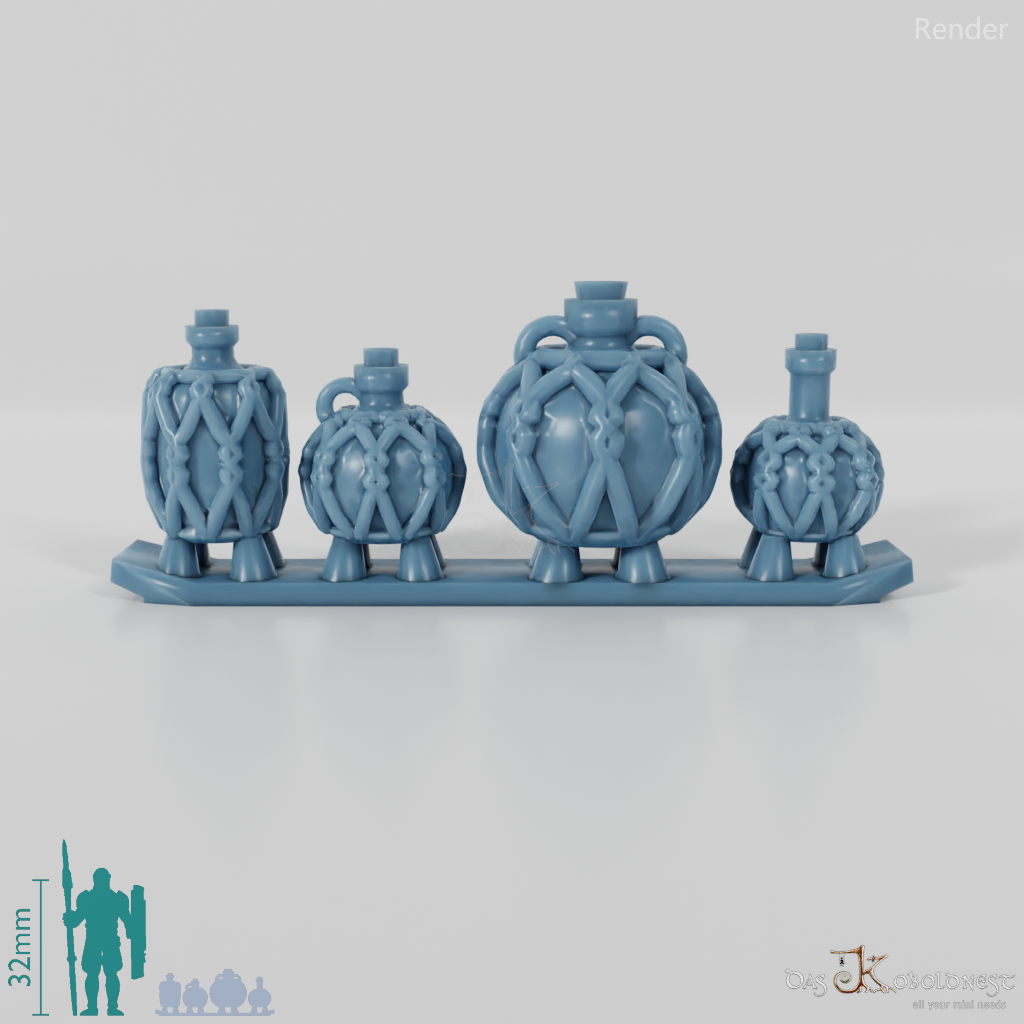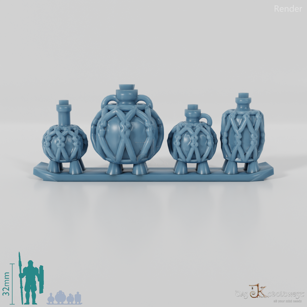 Vier verschiedene runde Flaschen in geflochtenen Körben Die Modelle werden in zusammenhängendem Rahmen geliefert und müssen beispielsweise mit einem Bastelmesser abgetrennt werden. Model by Pellinor1, licensed under CC BY 4.0