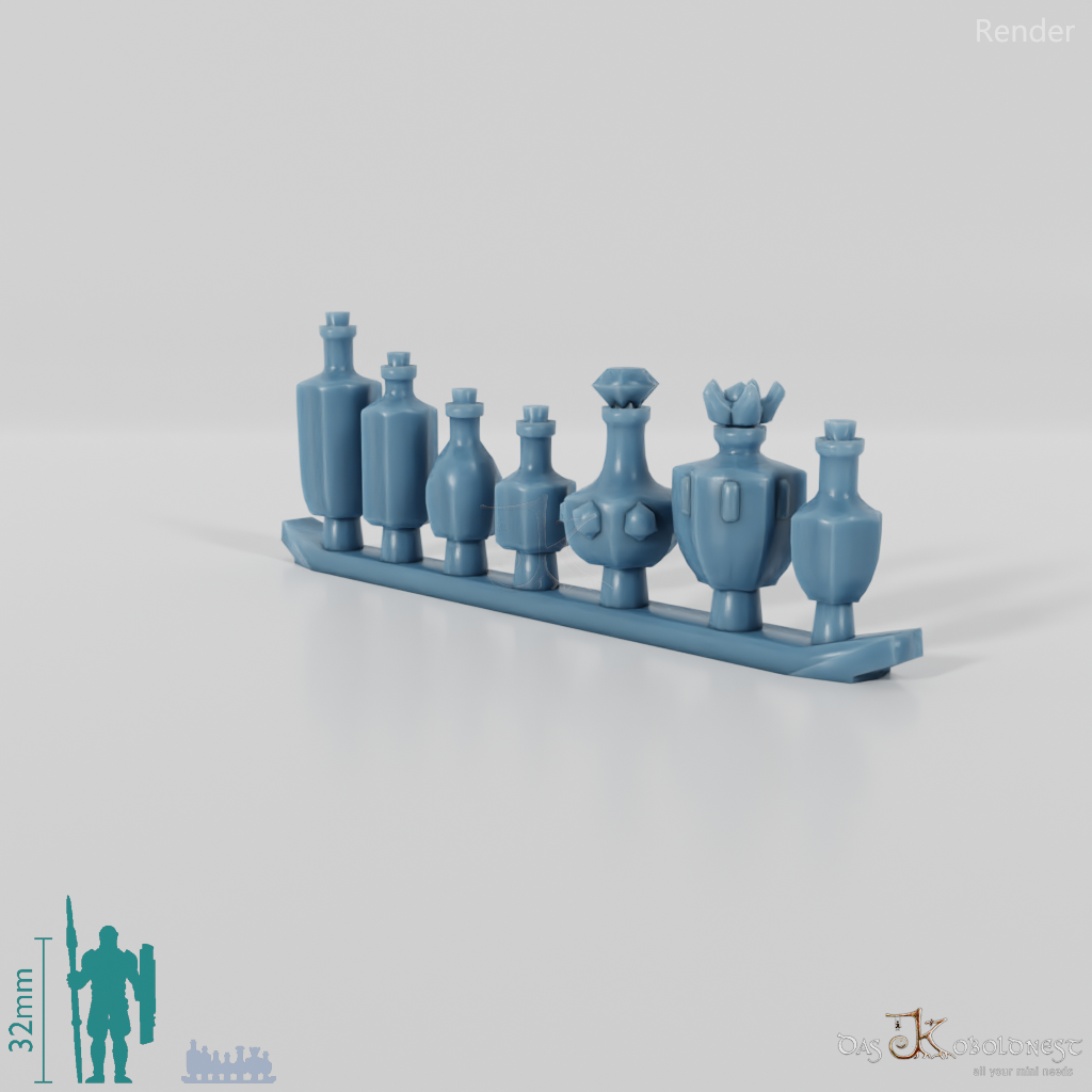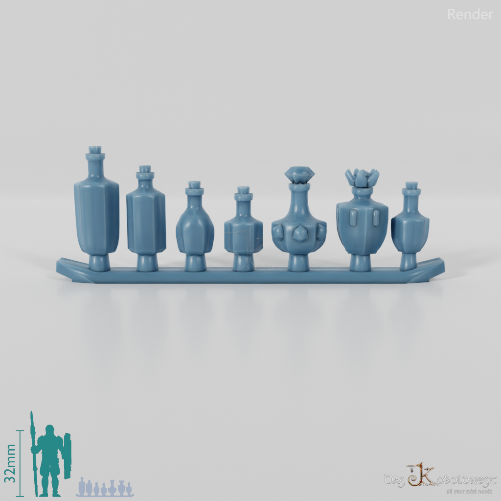 Sieben verschiedene, verkorkte Trankflaschen Die Modelle werden in zusammenhängendem Rahmen geliefert und müssen beispielsweise mit einem Bastelmesser abgetrennt werden. Model by Pellinor1, licensed under CC BY 4.0
