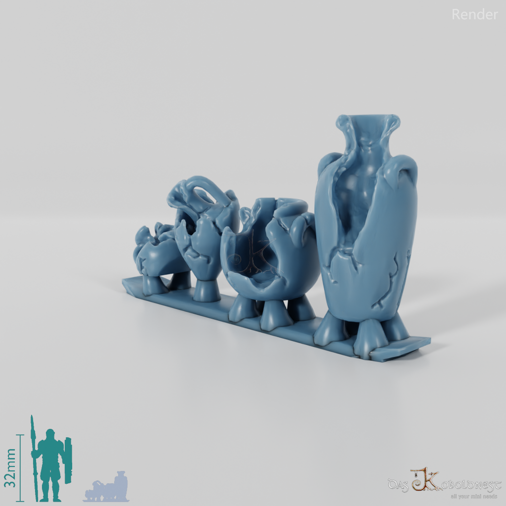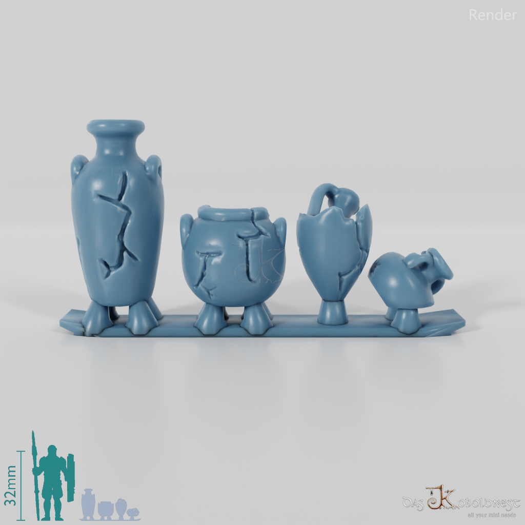 Vier verschiedene, zerbrochene Tongefäße Die Modelle werden in zusammenhängendem Rahmen geliefert und müssen beispielsweise mit einem Bastelmesser abgetrennt werden. Model by Pellinor1, licensed under CC BY 4.0