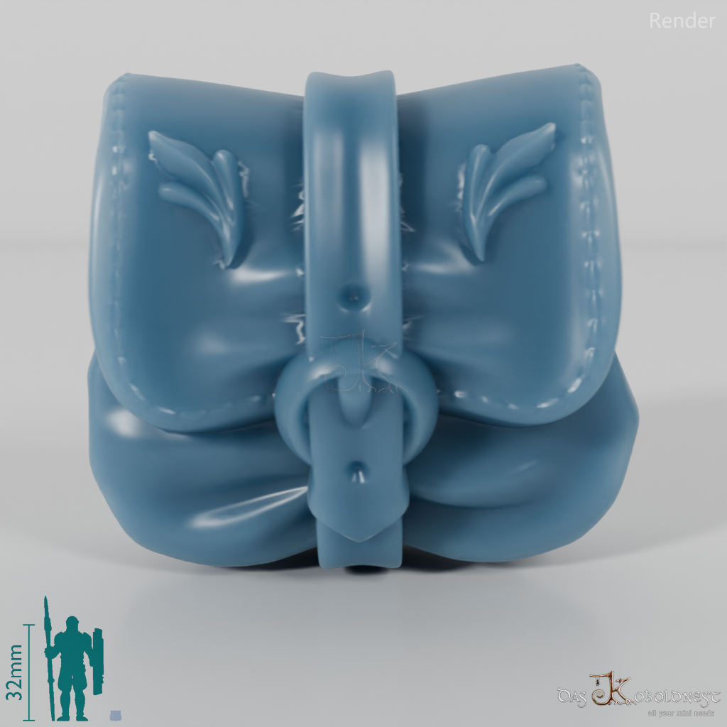 Kleine, verzierte Gürteltasche. Das Modell kann beliebig mit allen modularen Körpern der Reihe "Greenshire Vigilantes" kombiniert werden. Im Customizer von The Printing Goes Ever On kannst du dir selbst eine Vorschau deiner modularen Halblingarmee erstellen und die perfekten Kombinationen für dich finden.