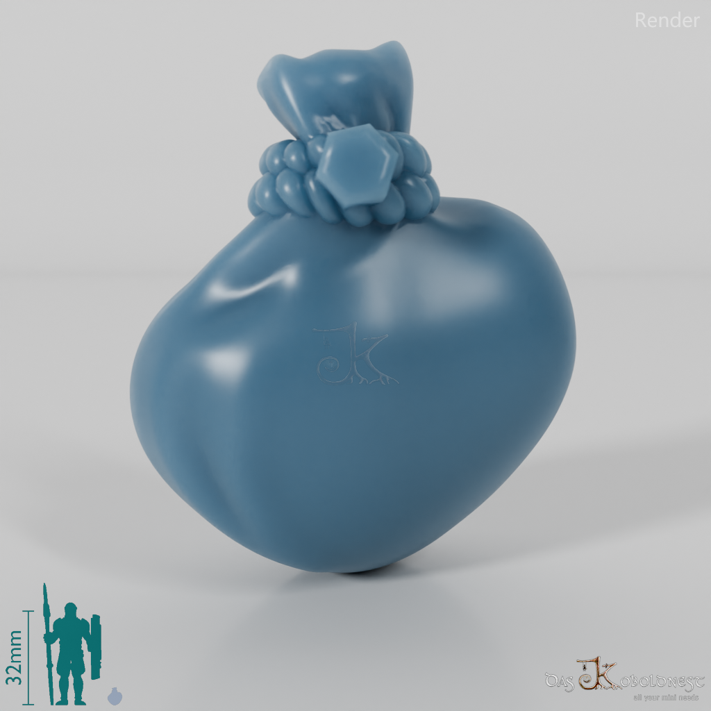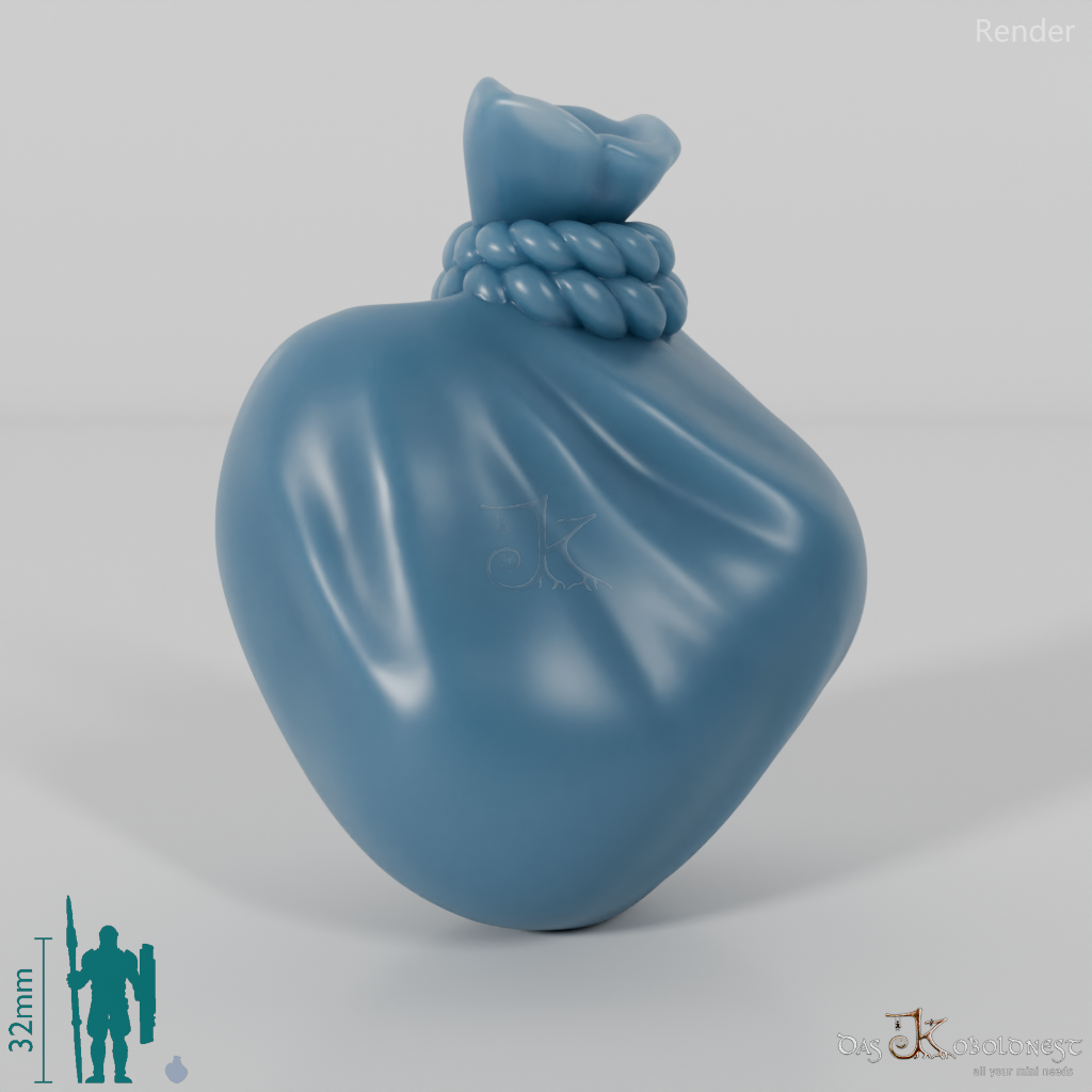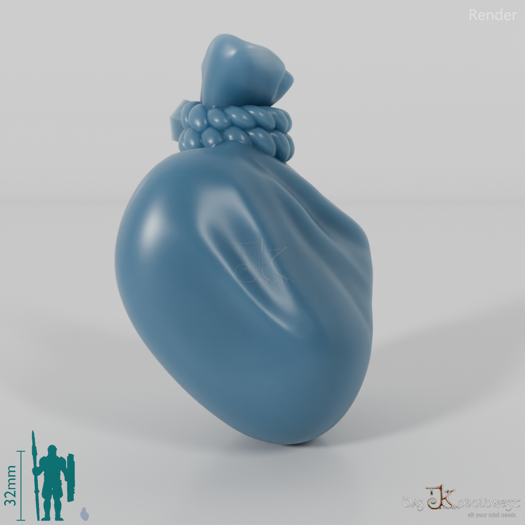 Kleiner, zusammengeschnürter Stoffsack. Das Modell kann beliebig mit allen modularen Körpern der Reihe "Greenshire Vigilantes" kombiniert werden. Im Customizer von The Printing Goes Ever On kannst du dir selbst eine Vorschau deiner modularen Halblingarmee erstellen und die perfekten Kombinationen für dich finden.
