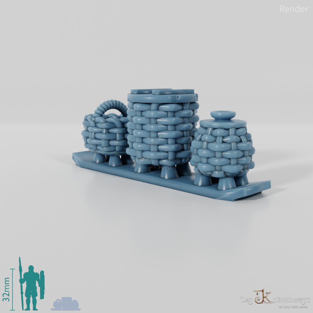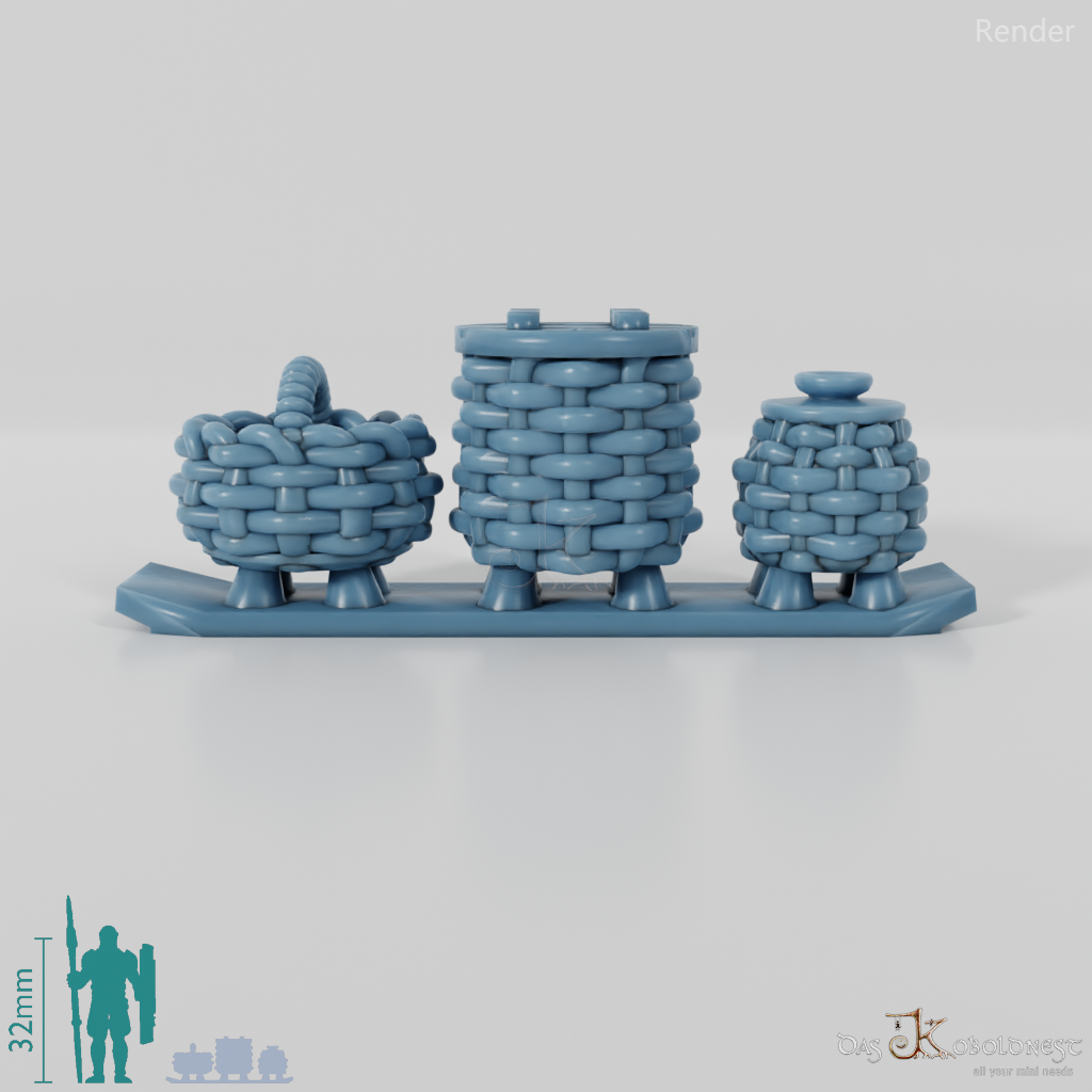Drei verschiedene geflochtene Körbe mit Deckel Die Modelle werden in zusammenhängendem Rahmen geliefert und müssen beispielsweise mit einem Bastelmesser abgetrennt werden. Model by Pellinor1, licensed under CC BY 4.0