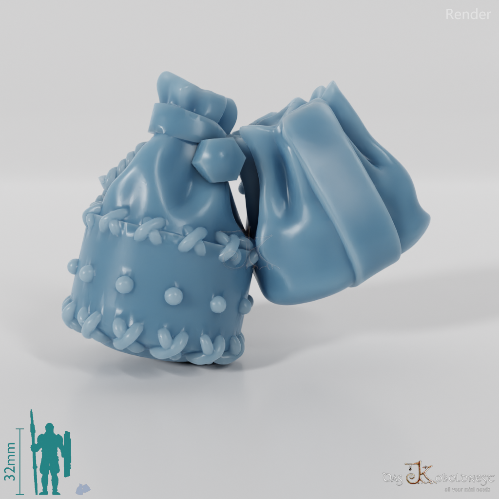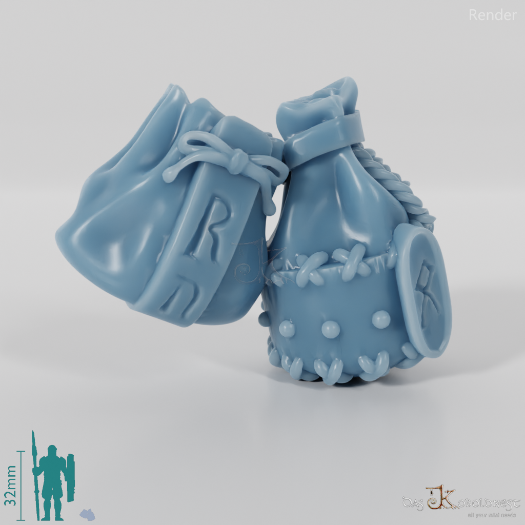 Zwei aneinanderhängende, runenverzierte Stoffbeutel. Das Modell kann beliebig mit allen modularen Modellen der Reihe "Zusammenruf der Zwerge" kombiniert werden. Im Customizer von The Printing Goes Ever On kannst du dir selbst eine Vorschau deiner modularen Zwerge erstellen und die perfekten Kombinationen für dich finden.