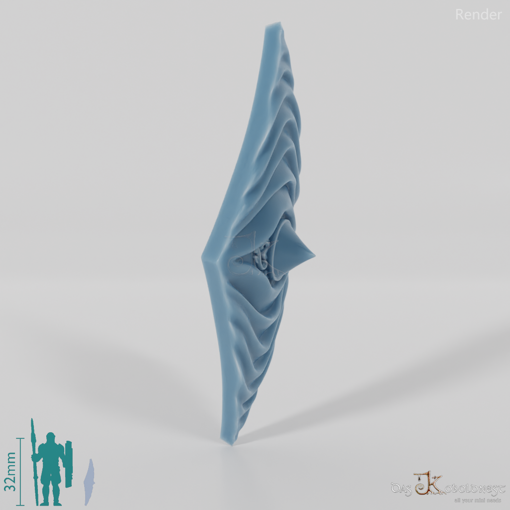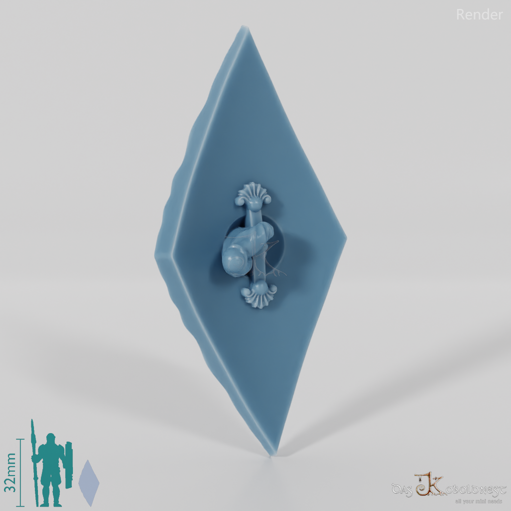 Kleiner, eckiger Schild mit Schlagdorn, der von einer Hand mit fingerlosen Handschuhen gehalten wird. Das Modell kann beliebig mit allen modularen Modellen der Reihe "Die Elfen versammeln sich" kombiniert werden. Modell wahlweise mit rechter oder linker Hand verfügbar.
