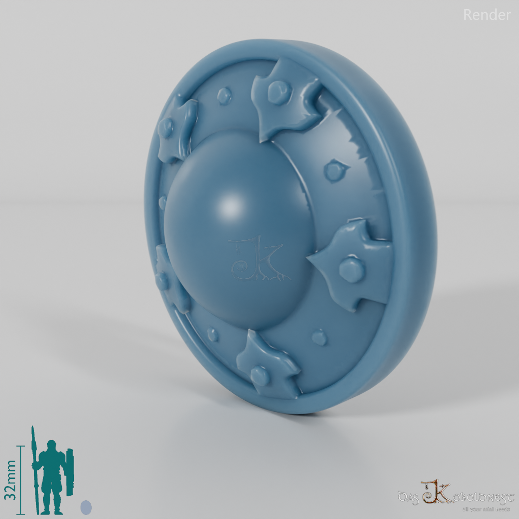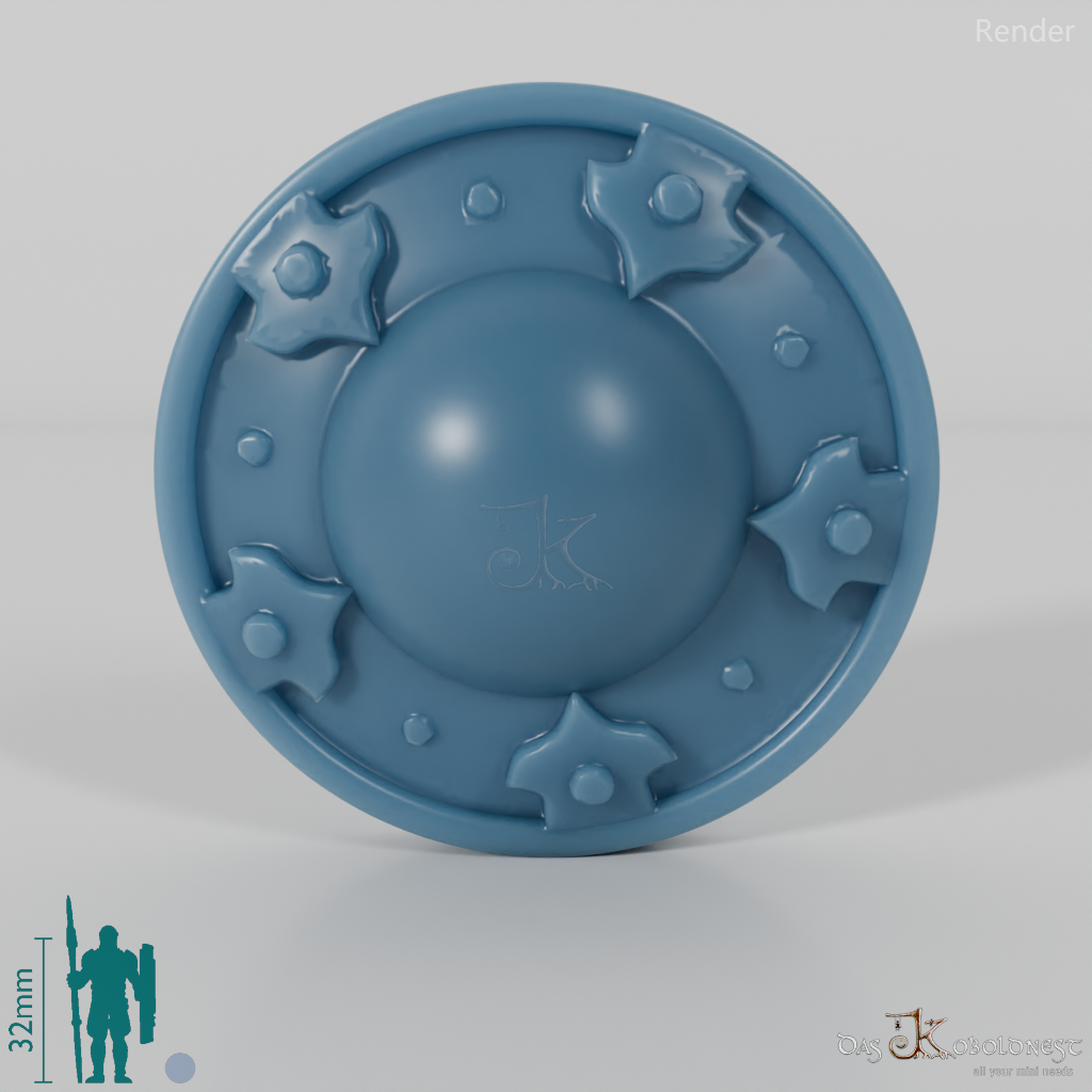 Kleiner, einfacher Rundschild. Das Modell kann beliebig mit allen modularen Körpern der Reihe "Greenshire Vigilantes" kombiniert werden. Im Customizer von The Printing Goes Ever On kannst du dir selbst eine Vorschau deiner modularen Halblingarmee erstellen und die perfekten Kombinationen für dich finden.