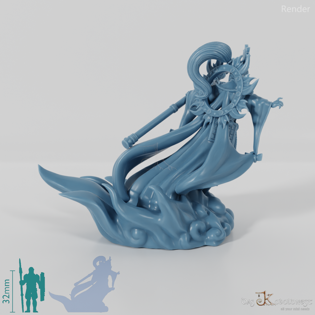 Hohe Kami und Gottheit der Sonne, die einen Fächer und einen Stab trägt und einen lodernden Flammenring hinter sich hat