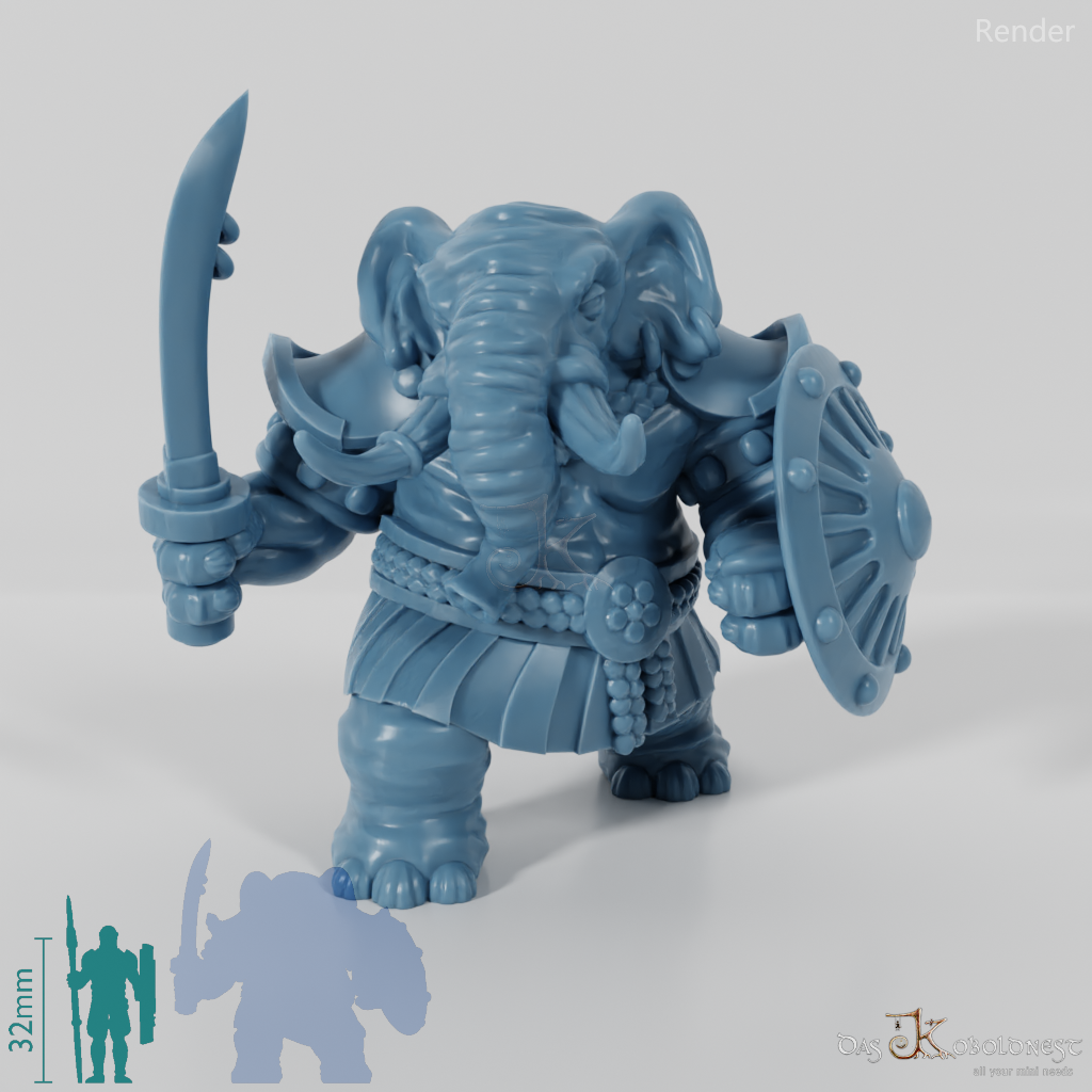 Humanoider Elefant in Rüstung mit Säbel und Schild
