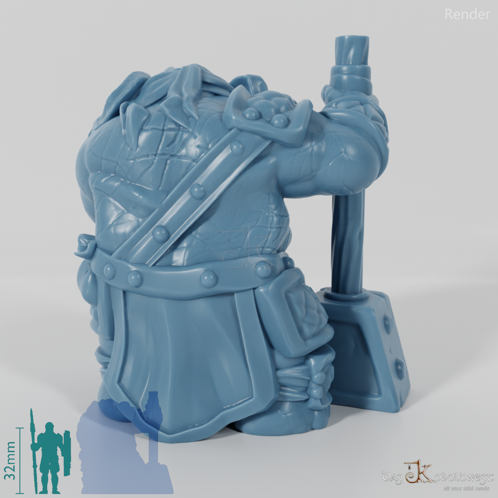 Humanoider Elefant mit Augenbinde, auf Kriegshammer und Runenstein gestützt